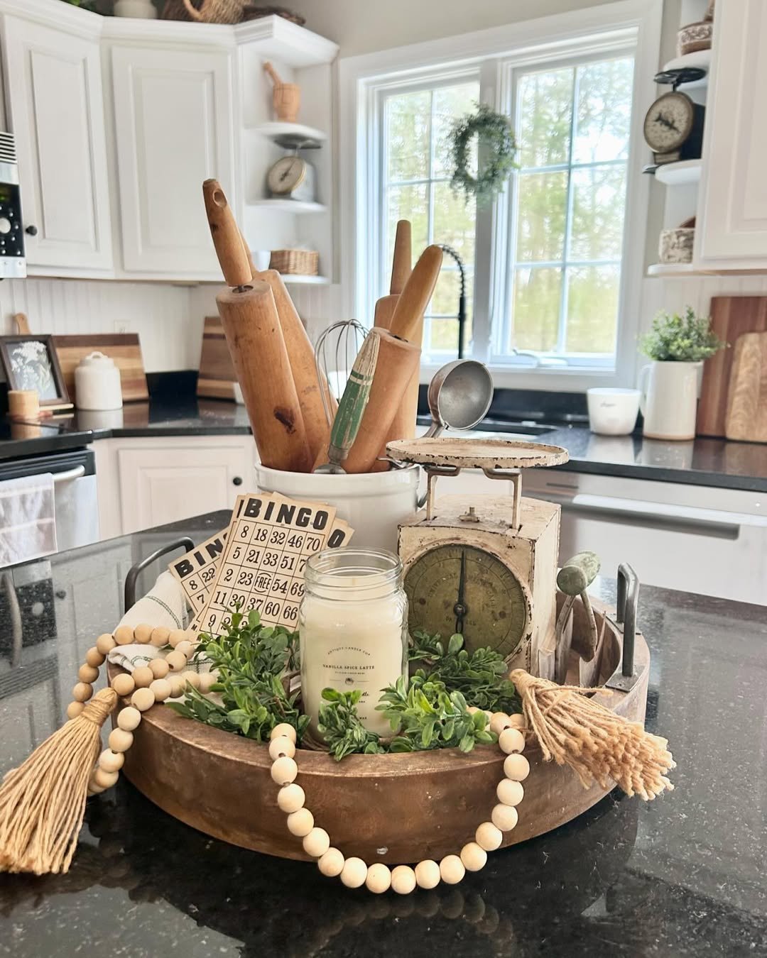 This tray feels like a quiet nod to old kitchens that always had something baking. Wooden rolling pins, bingo cards, and a worn scale come together with greenery to soften the scene.