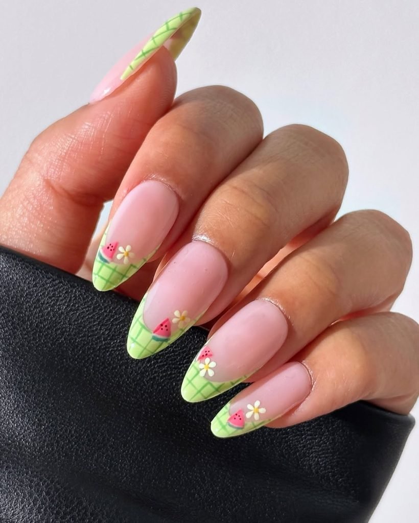These nails are a love letter to summer picnics under cloudless skies—dainty, playful, and sweetly nostalgic. A soft nude base keeps things minimal, while the tips bloom into a lime-checkered French design that feels lifted straight from a gingham blanket. Mini watermelon slices and tiny daisies are scattered with intention, like delicate treats laid out on fresh grass.