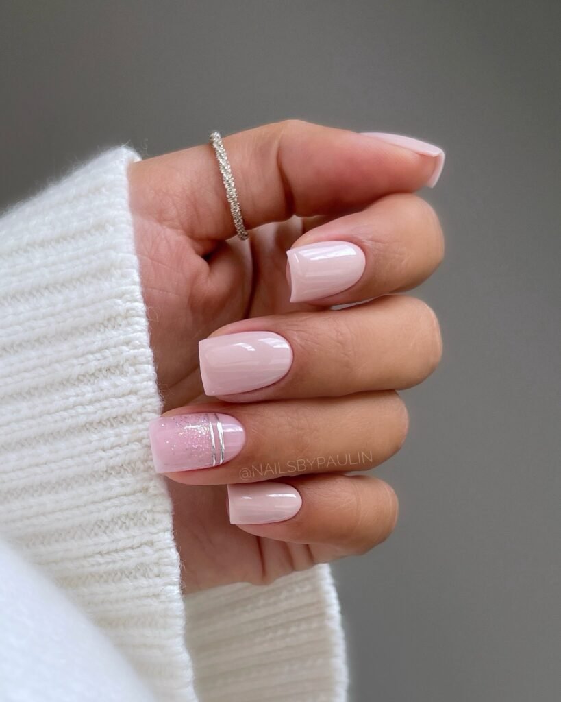Minimal, glossy, and topped with the tiniest whisper of sparkle—this is understated wedding perfection. The accent nail with clean metallic striping adds just the right hint of modern detail without disturbing the softness.