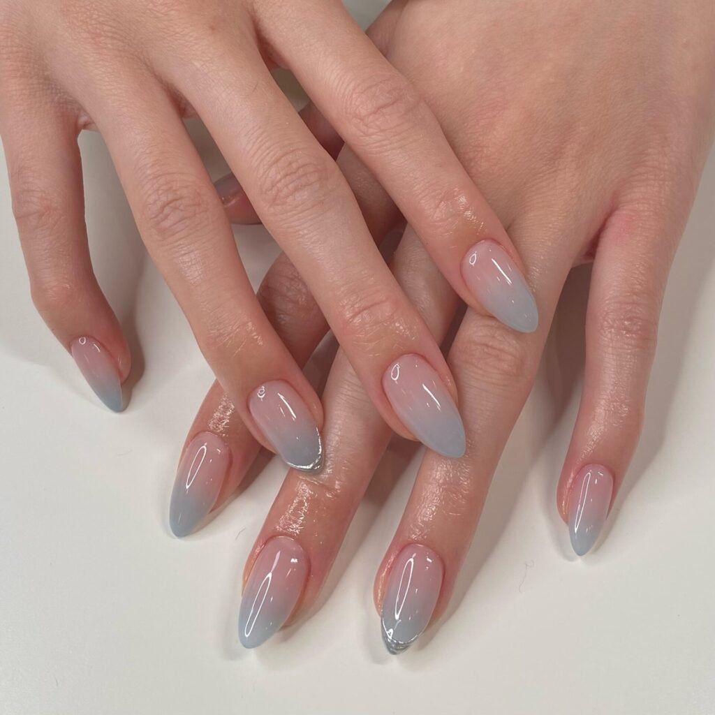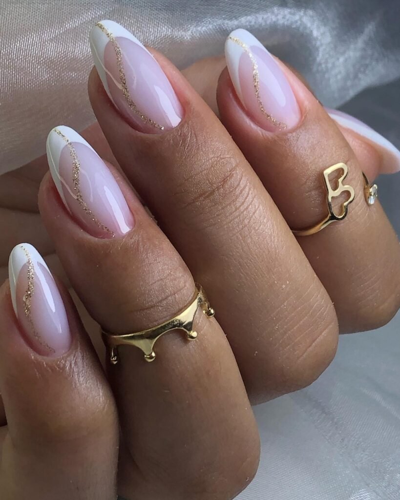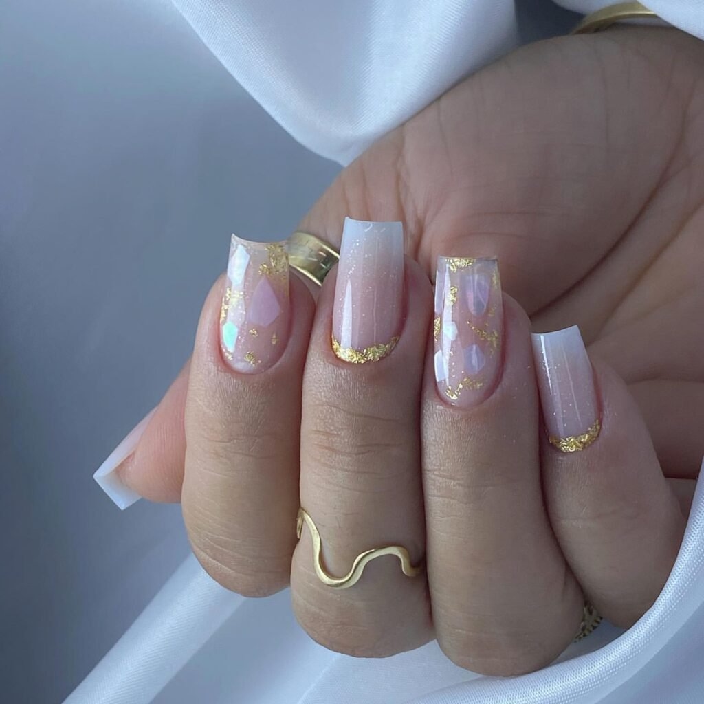 A dreamy gradient paired with delicate flecks of gold—this is luxury without screaming for attention. The gold detailing melts into the nails beautifully, giving major “soft glam bride” energy.