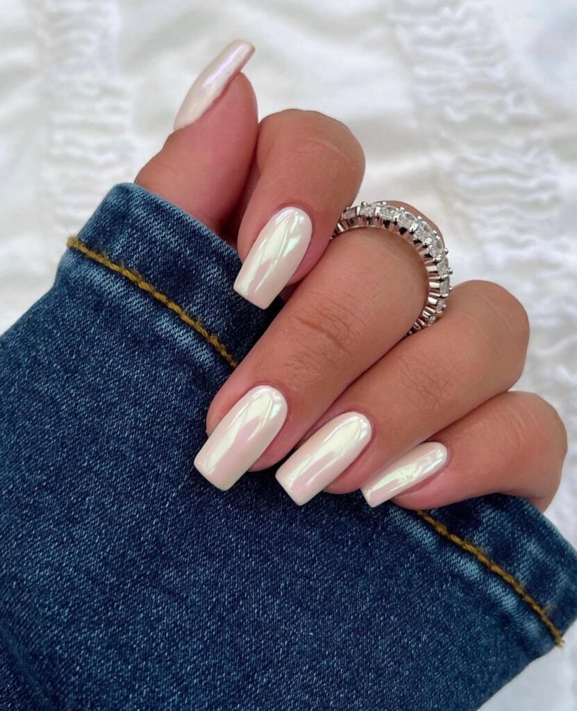 This creamy, pearly chrome finish is giving full bridal glow. It catches light like water and looks unbelievably smooth. Plus, the medium-square shape keeps everything modern and polished.