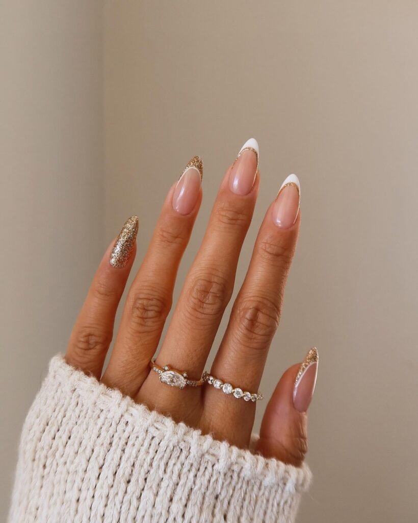 Gold glitter tips meet soft white French curves, creating a bridal set that feels festive, elegant, and a little glamorous. It’s the perfect “celebration nail” that works beautifully for receptions and weddings alike.