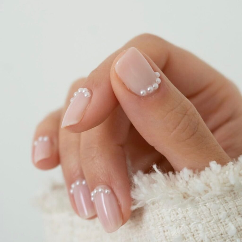 Tiny pearls outlining the base of each nail? That’s bridal poetry. This design is both delicate and deeply bridal, reminiscent of veils, gowns, and heirloom accessories.