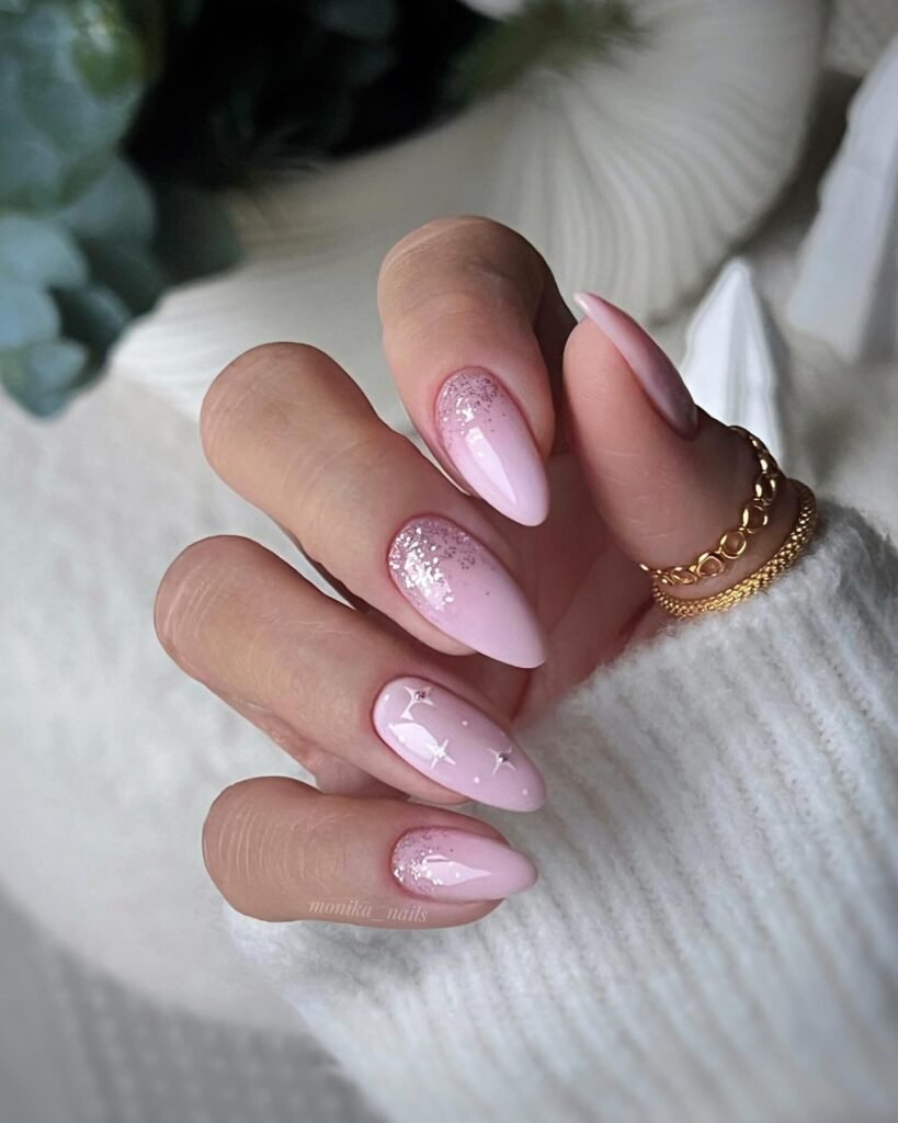 Soft pink paired with floating glitter accents and tiny star details? Pure magic. This set feels light, airy, and romantic—like sparkles caught in a breeze. The gradient effect also adds a soft glow to the fingertips.
