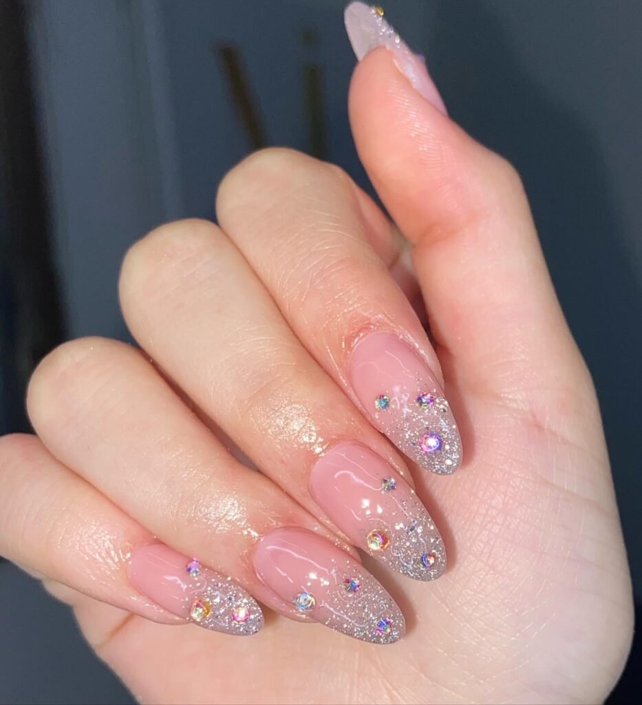 Crystal studs meet a soft French base for a look that sparkles without overwhelming. The gems are placed thoughtfully so each nail twinkles just enough when you move your hand.