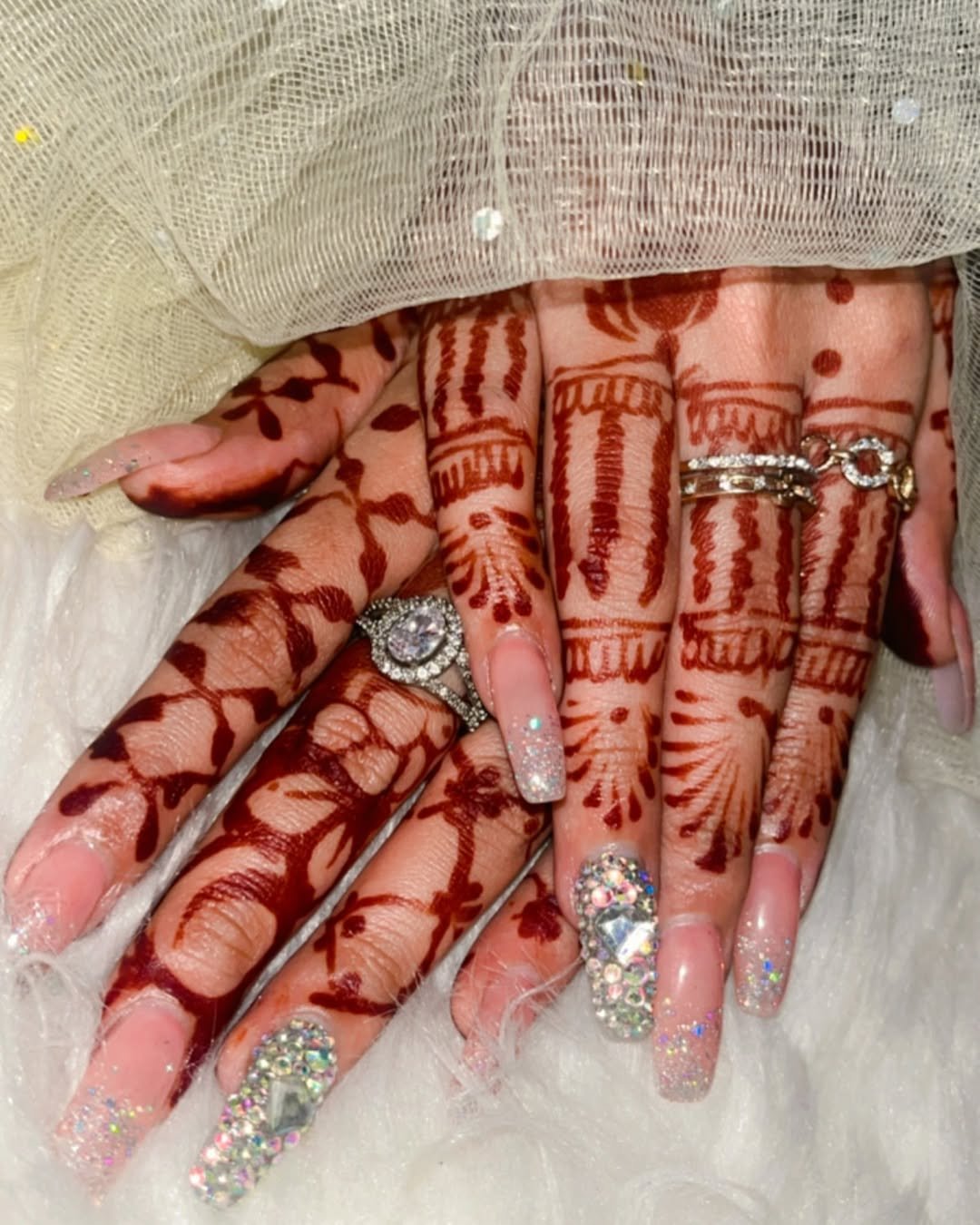 Okay, we need a moment for this one. @nails_club_by_shiridhi gave us bridal nails that deserve their own aisle. Long, clear-tipped acrylics are drenched in glitter and bedazzled stones, while the henna adds a traditional richness that beautifully contrasts with all the shine.
