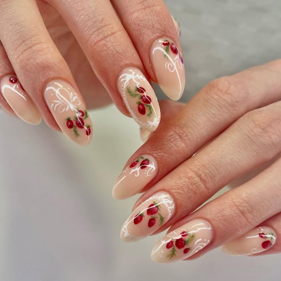 Wedding season meets floral fantasy with this delicate cherry motif by @envoguenailsofficial. The creamy base sets the stage for intricate red berry blossoms and ornamental white lace linework. It’s like your favorite romantic novel got turned into nail art.