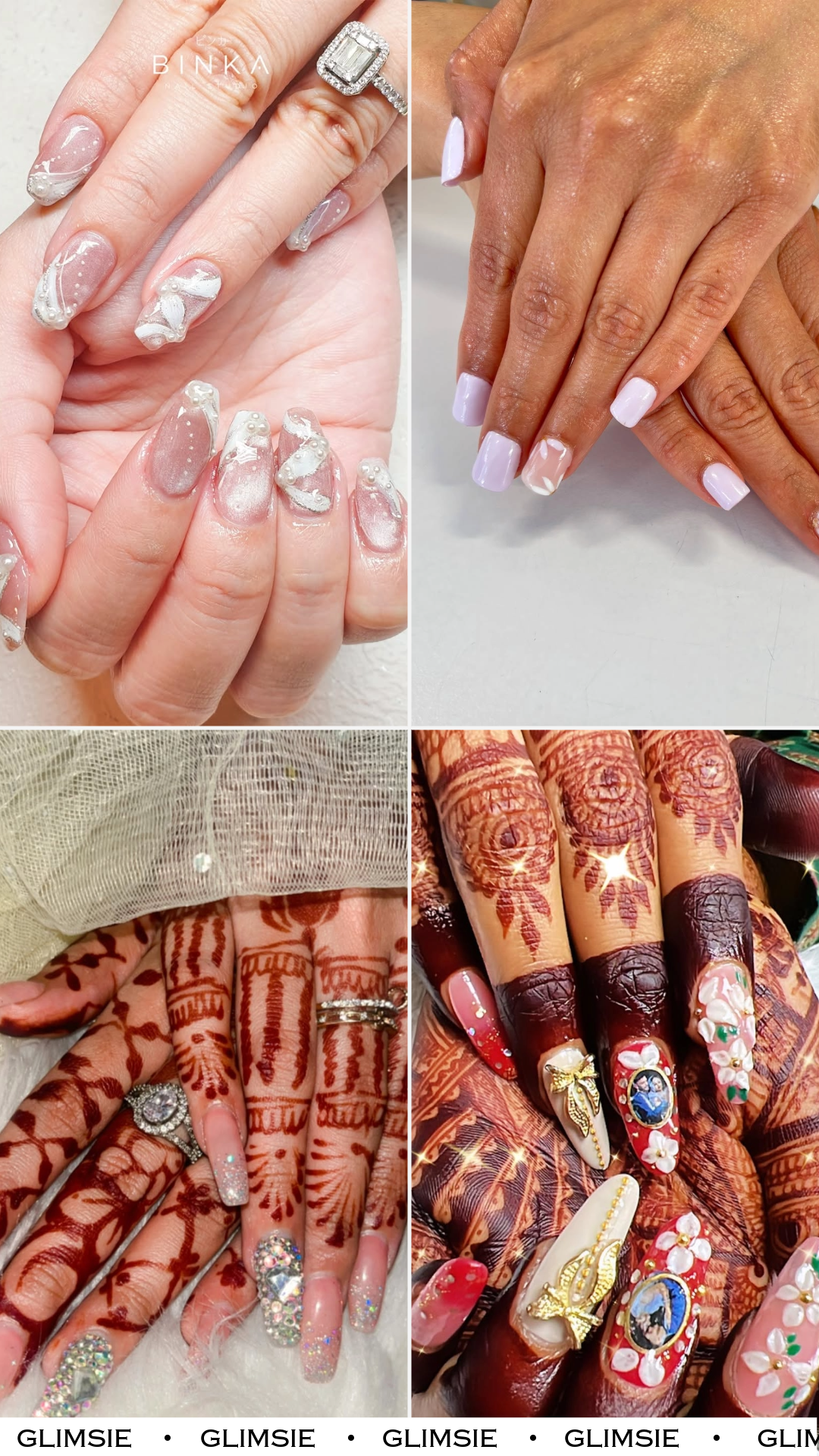 Henna and sparkle make such a dreamy combo, and this set proves it. With soft nude-pinks topped in glitter gradients, these nails play backup dancer to that stunning mehndi—but still hold their own. They’re subtle, but never boring.