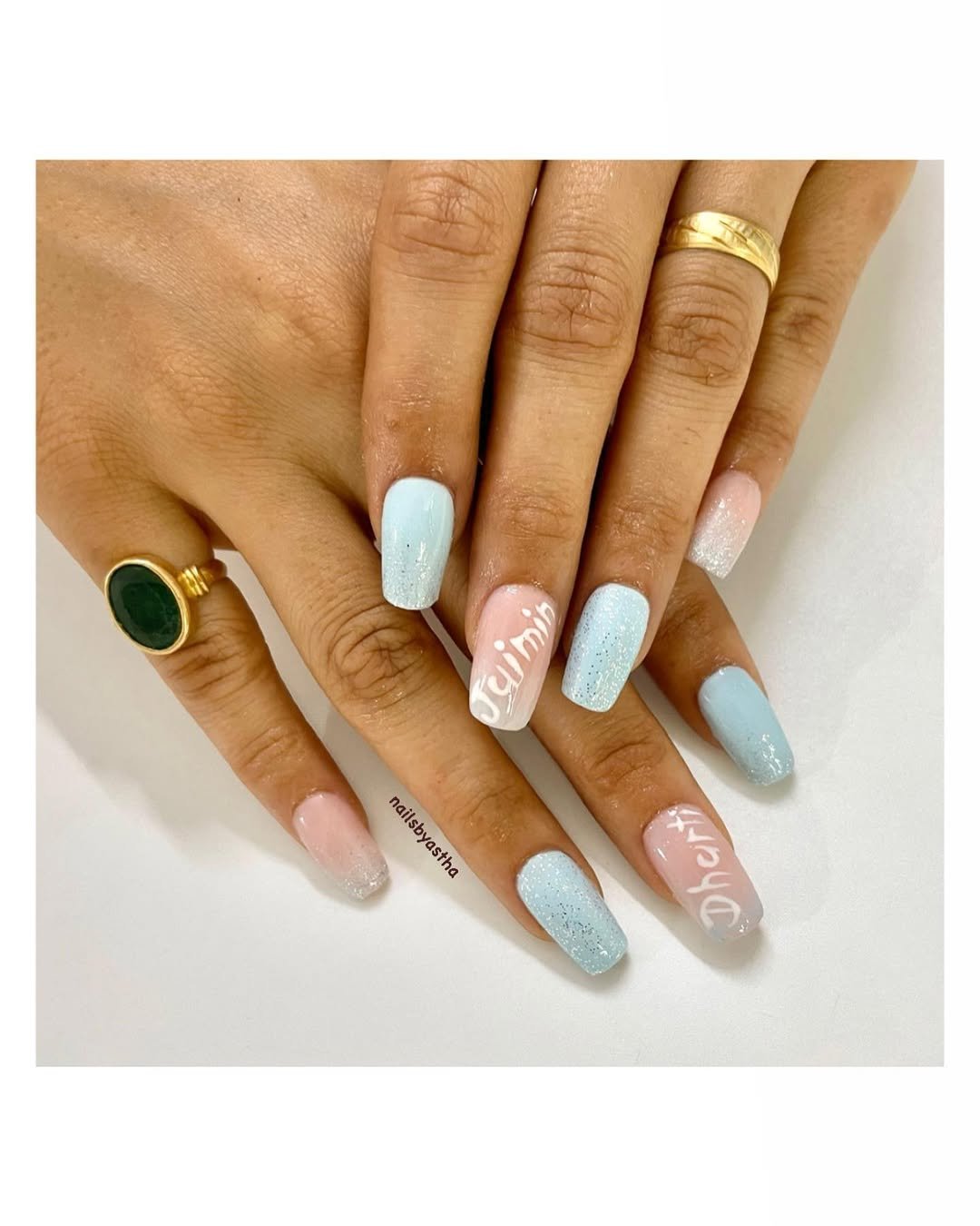 @Nailsbyastha went full dreamy with this pastel blue and pink ombré set, finished off with a gentle splash of shimmer. But what really takes this to the next level? Custom name art on two accent nails—because why not add some personalization to your glam?