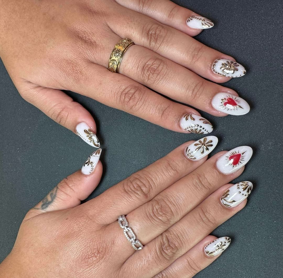 We see you @milanonailspaaustin with the baroque-level artistry! This set goes all out—white base with golden scrollwork, florals, and literal hearts. It’s giving sacred, celestial, and slightly rebellious all at once. The designs almost look like they belong in a Renaissance painting… or maybe on the coolest tarot reader you know.