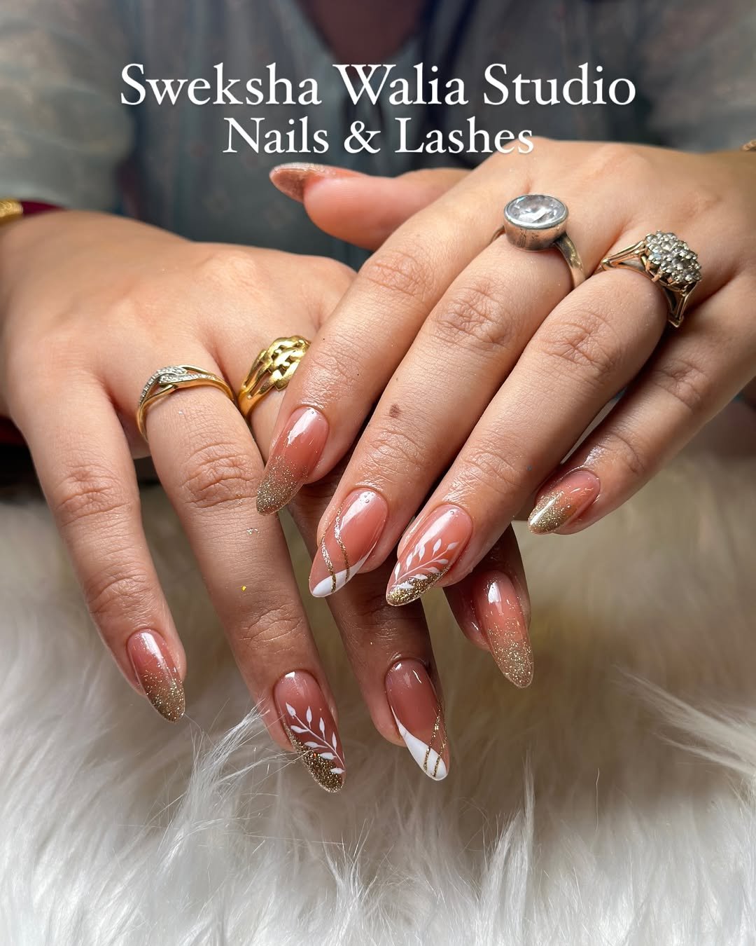 This design strikes the perfect balance between earthy neutrals and soft glam. The golden tips are grounded with a translucent nude base, while the white leaf art brings a refreshing, botanical touch. It’s a wearable set that still says, “I didn’t come to play.”