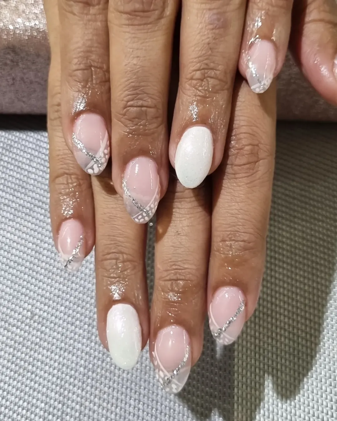 This set is winter bride energy, but make it modern. Icy whites, crisscrossed silver accents, and tiny dots make each nail look like it’s dusted with snowflakes. That one fully frosted nail? A vibe. It brings the texture in without shouting about it.