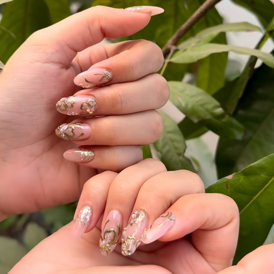 This set by @nailishq_hyd is basically a garden party for your hands. Transparent tips and muted blush bases are decorated with 3D floral designs in shimmering gold. It’s delicate yet show-stopping—like someone pressed petals in time and sealed them in glamour.