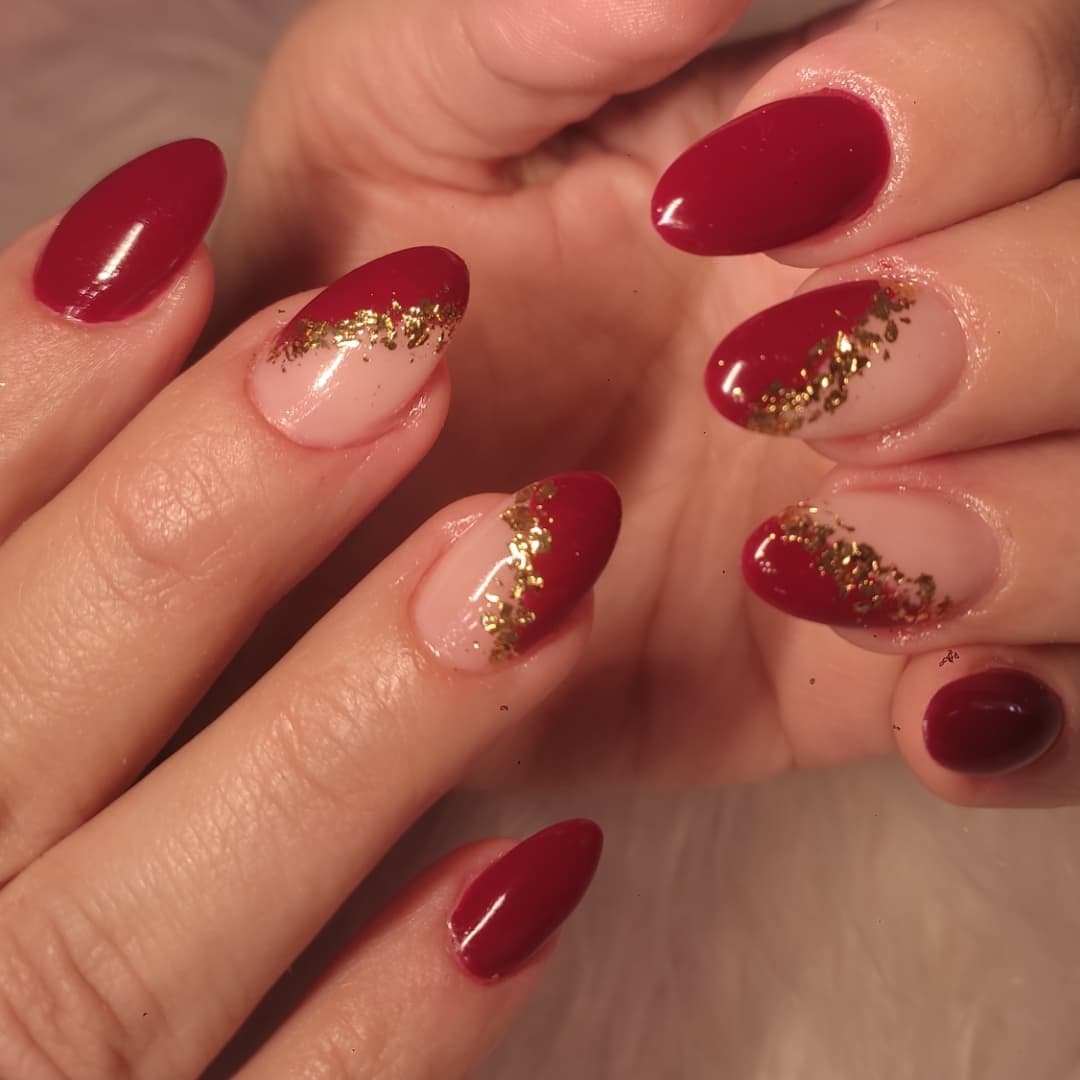 Simple, sleek, and sultry—this deep garnet red with gold flakes is the lowkey glam we all need this season. The mix of solid polish and French tips with that glitter fade is giving fancy dinner party but also wine night in. It’s rich, it’s moody, and it looks expensive (without needing to be).
