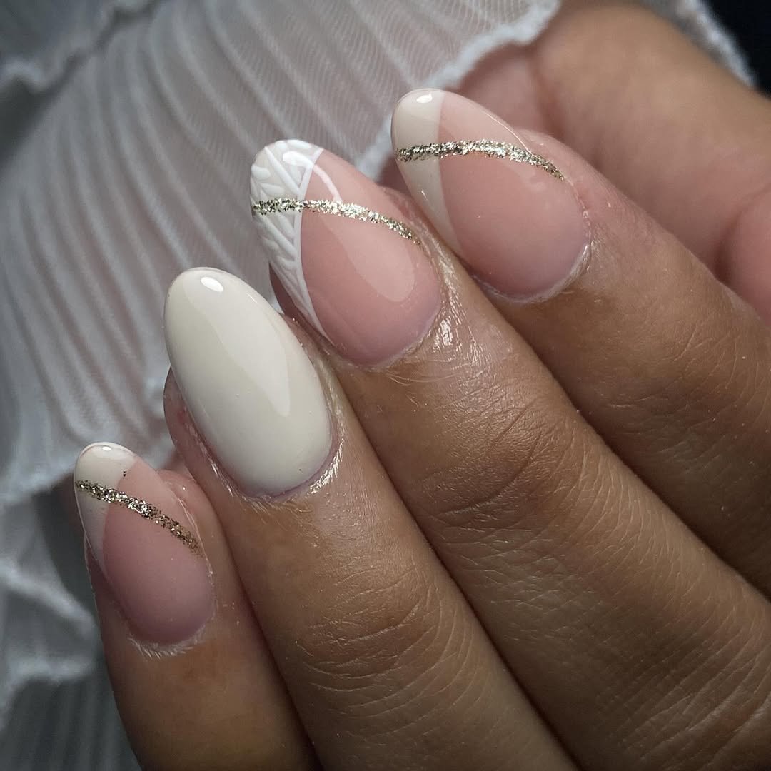 If minimalism had a wedding dress code, this would be it. @anii_nails takes the softest milky nudes and draws fine golden lines like delicate jewelry laid across your fingertips. One nail features intricate white detailing that looks almost hand-embroidered—very haute couture energy.