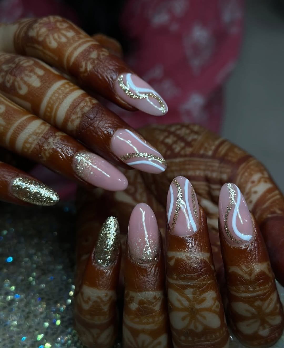 There’s something about pink, gold, and a little bit of glitter that just screams “wedding ready.” @thenailplace delivers a bridal-approved look that mixes soft blush tones with bold golden chrome accents and swirling white lines. It’s classic with a twist—kind of like when a traditional bride shows up in sneakers under her gown.