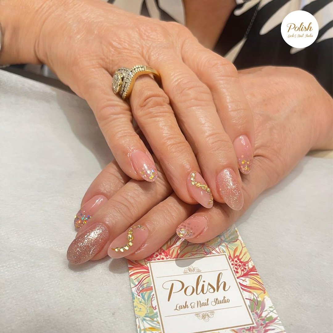 There’s an elegance to this set that just makes you breathe easier. @polish_lashandnailstudio created a soft neutral pink base with dainty gold sequins and glitter swirls. It’s the kind of manicure you wear when you’re feeling peaceful, polished, and put together.