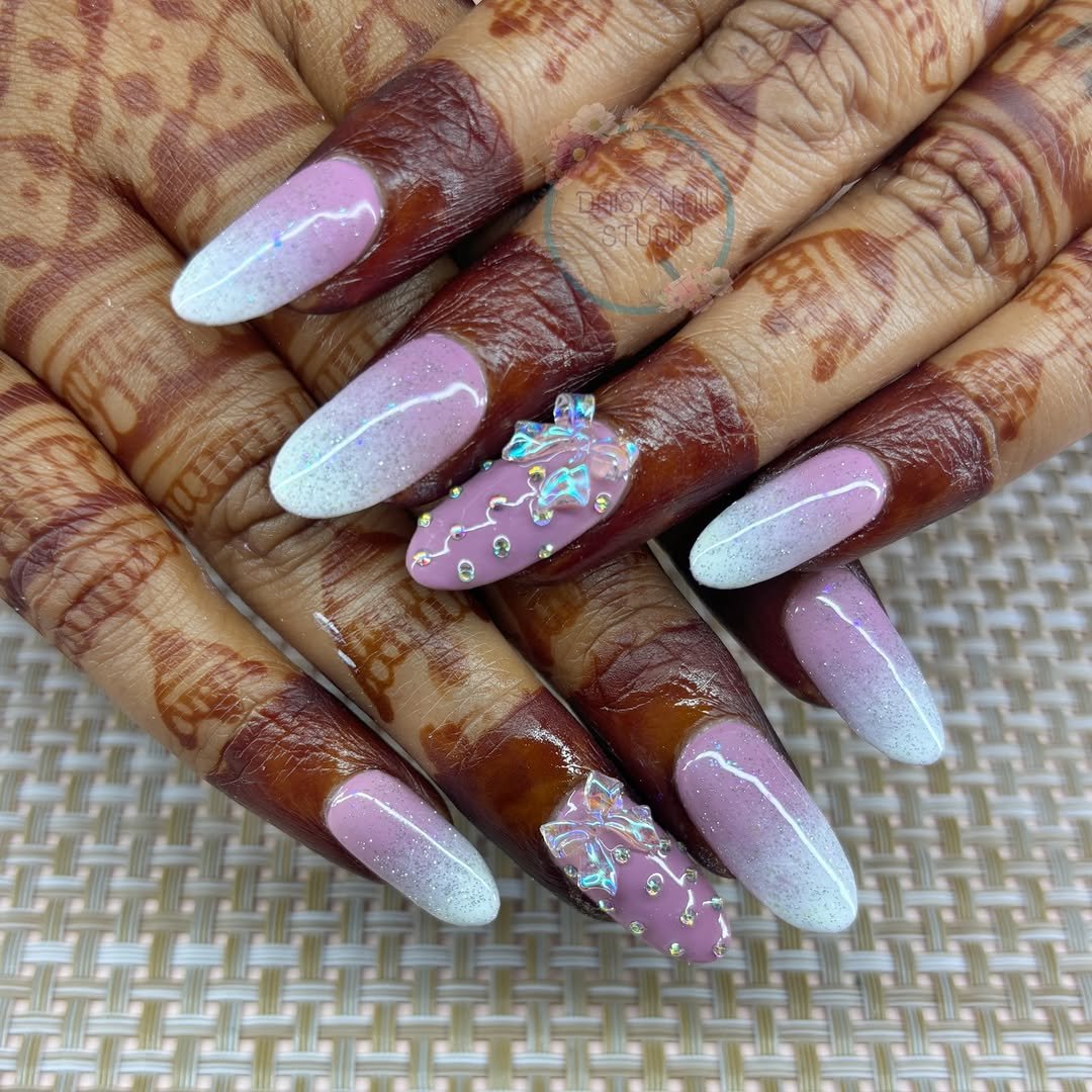 @daisynailstudio knows how to bring the sparkle. This set is dipped in lilac and finished off with ombré white gradients, glitter, and a 3D accent nail that legit looks like a gift box bow. It’s the kind of extra we want more of during wedding season.