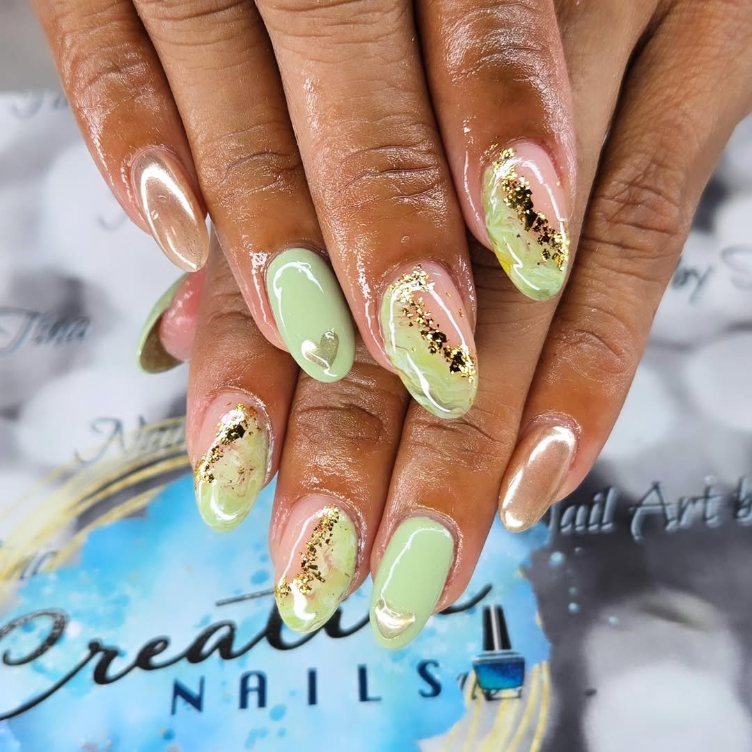 Wedding nails but make it cool-toned and edgy? @creativenailsii comes in with a fresh take using soft greens, gold foil, and abstract marbling. It’s giving destination wedding in the hills or beach-side vows, where sandals are welcome and style is effortless.