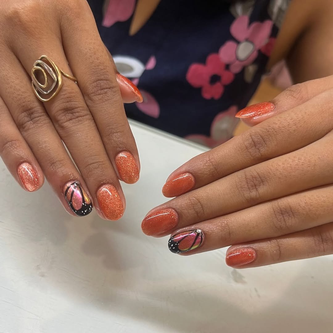 When in doubt, bring the butterflies. @justnails_hyd took warm orange shimmer polish and added monarch butterfly wings on the accent nails. It’s bright, bold, and ridiculously pretty. Wedding season doesn’t always have to be neutral—this proves it.