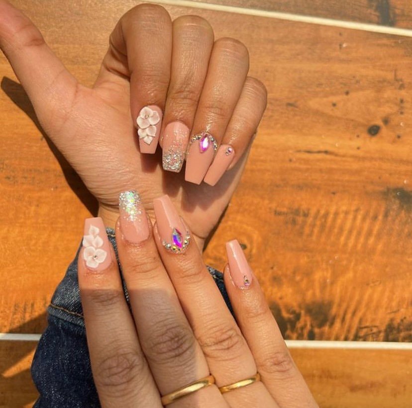 Soft peachy nudes, 3D flowers, and giant rhinestones—yes please. This is your “pretty in pastel” fantasy but with a boss babe twist. It’s like if a bouquet of fresh blooms and your favorite lip gloss got together and made nail art.