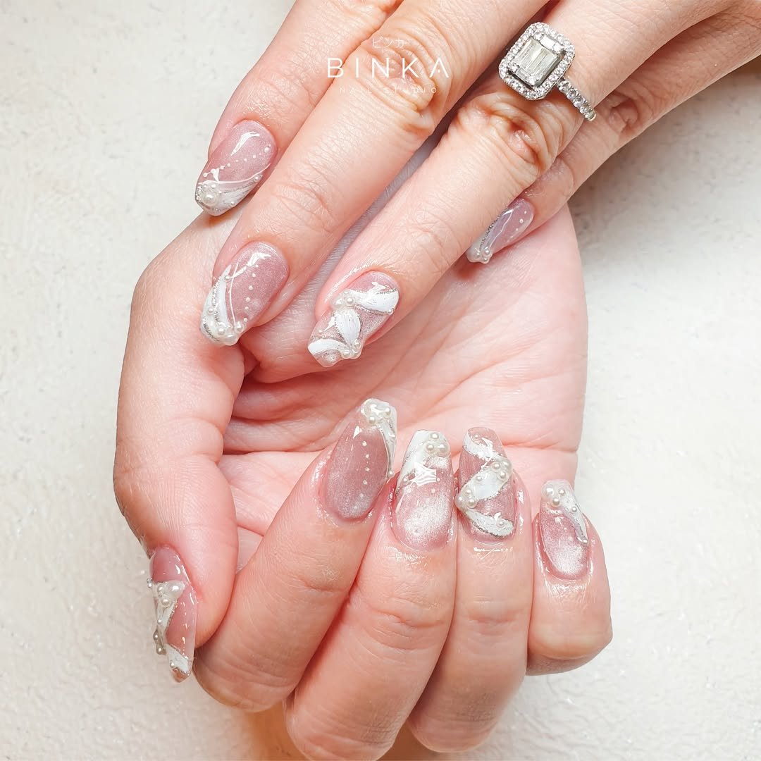 Now this is what we call “soft glam” meets fairy-tale bride. @binkastudio layered sheer pinks with milky swirls and finished it off with pearl appliqués that are practically whispering “say yes to the nails.” These designs are romantic, fresh, and full of dimension.