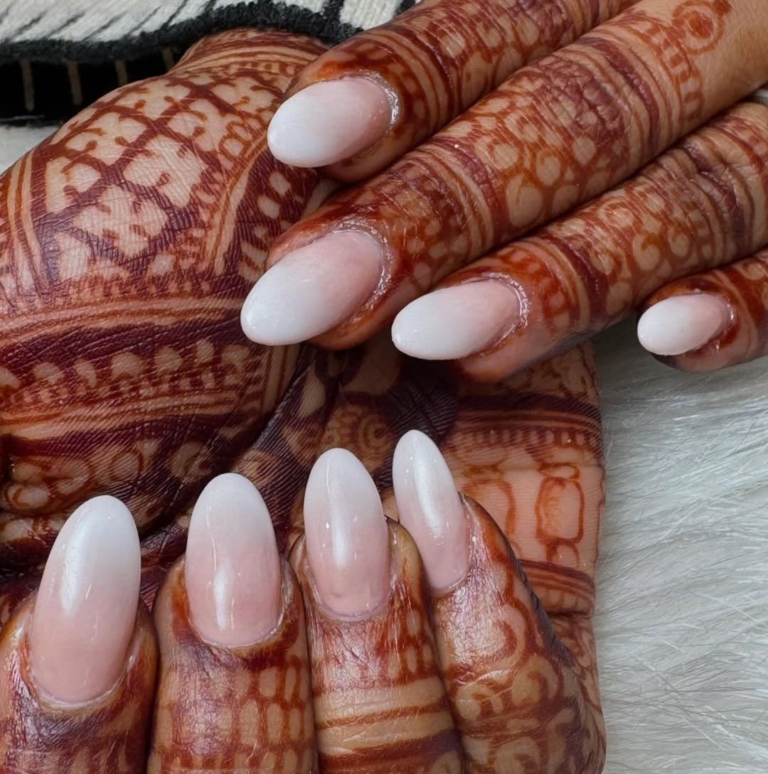 There’s something so satisfying about a well-blended ombré, and @periwinklenailstudio nailed it with this clean white-to-pink fade. The shape is classic almond, but the henna really elevates the whole look—it’s traditional meets modern, and we’re obsessed.