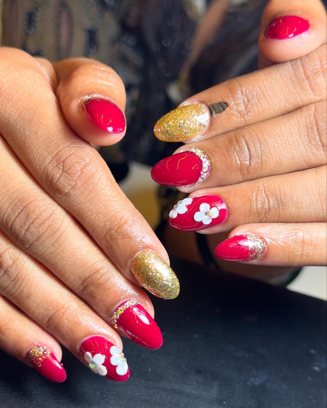 These are your confident-girl nails. @pitch_perfect_nails brought the heat with bold red polish, dazzling gold glitter, and floral 3D accents that practically dance. Each finger tells a story, and the contrast is just chef’s kiss.