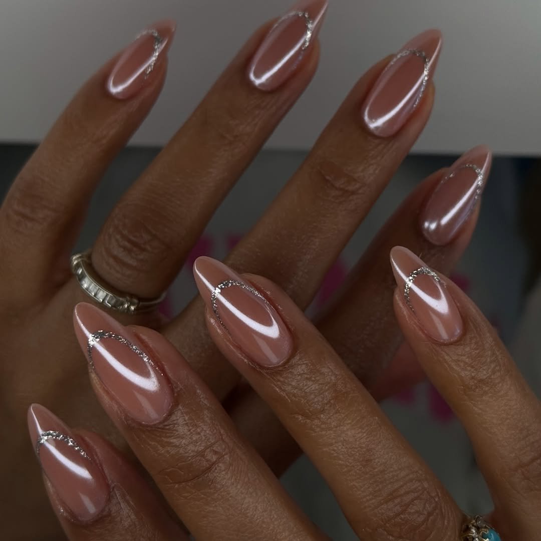 These nails are that quiet luxury aesthetic nailed down—literally. @lovelynailspot went for a soft blush base with an opalescent sheen that feels like moonlight on skin. The real kicker? That silver micro-glitter lining that elegantly outlines each nail like delicate jewelry.