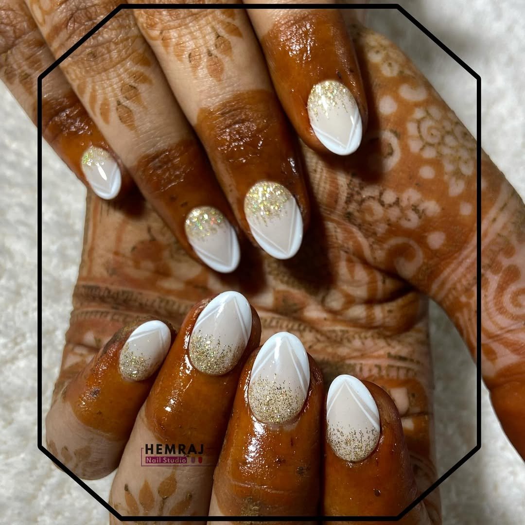 Now this is what we call regal. @hemraj_nail_studio brought out the big guns with this almond-shaped set—crisp white V-tips topped with gold glitter that fades into creamy perfection. Think royal wedding meets modern mehendi vibes.