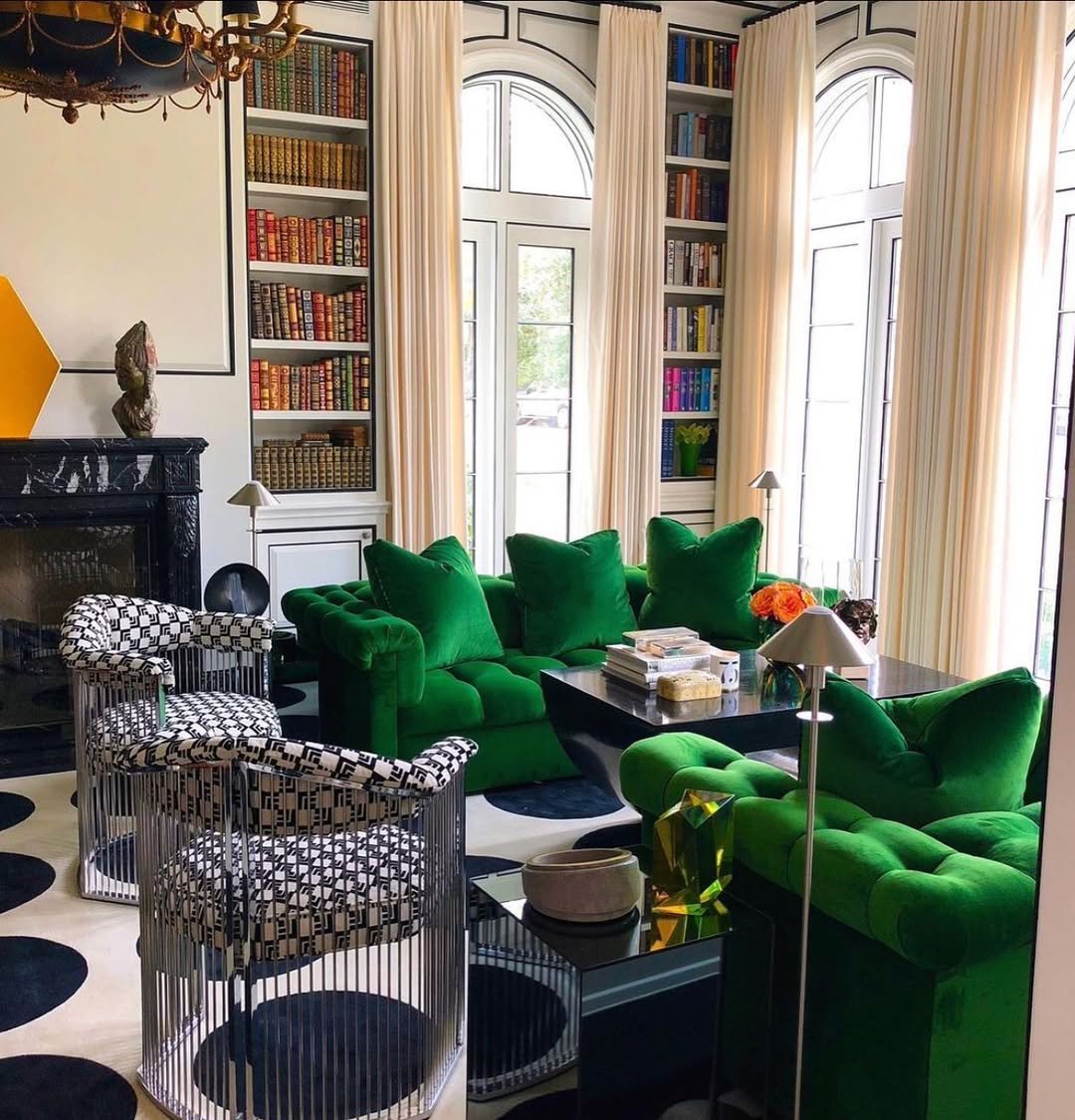 And then we end on something a little dramatic. That deep green velvet, the graphic rug, the wall of books, it all feels rich and intentional with a strong point of view.