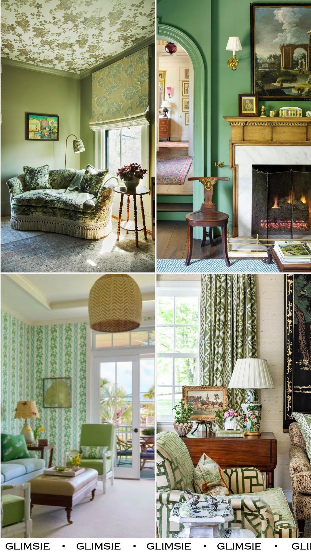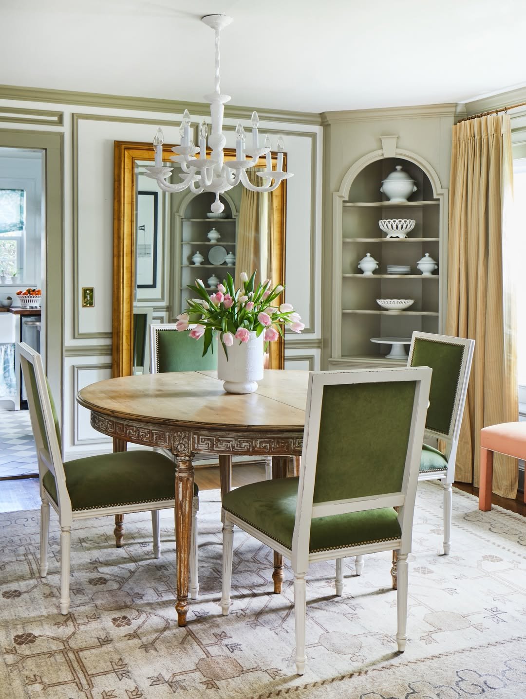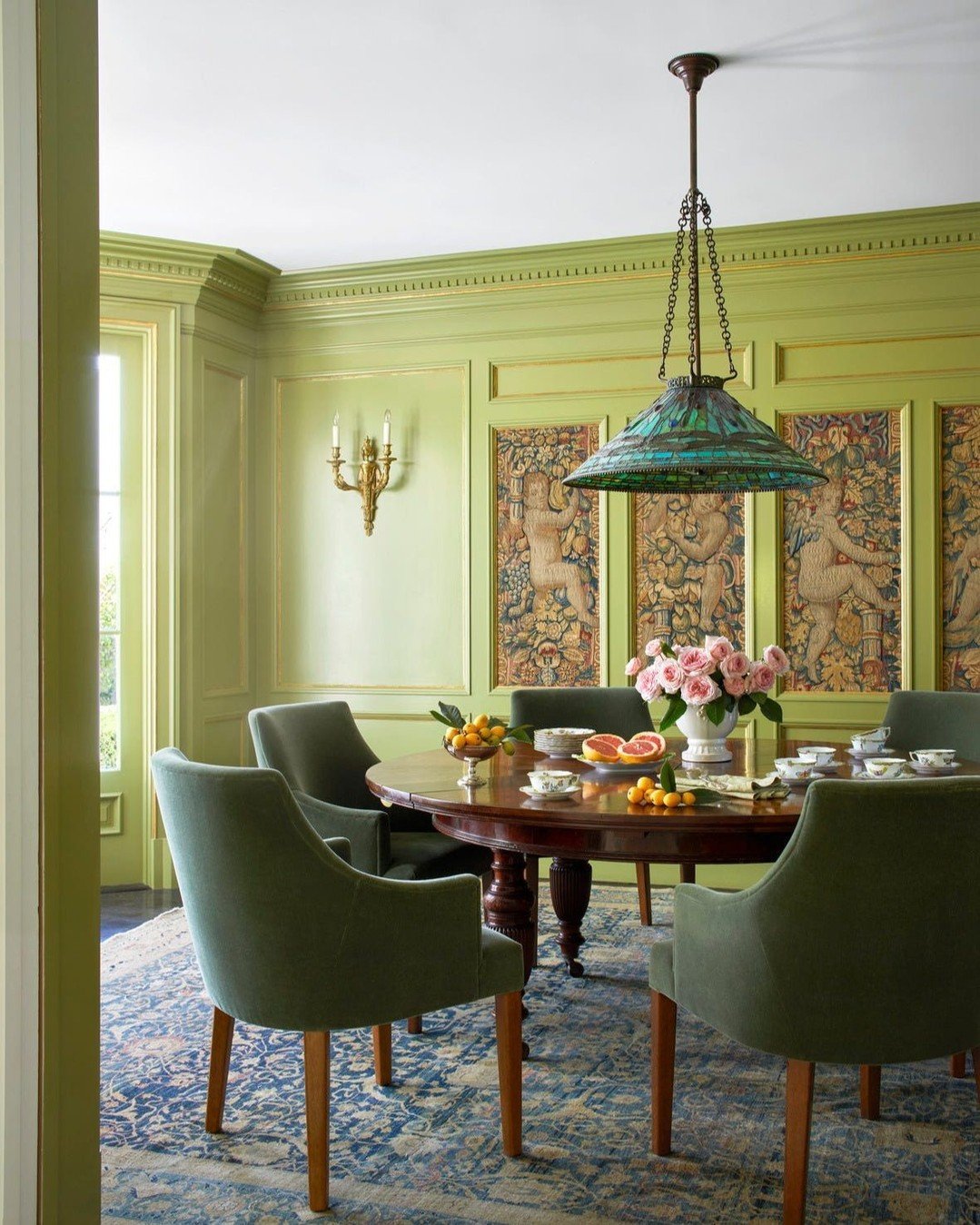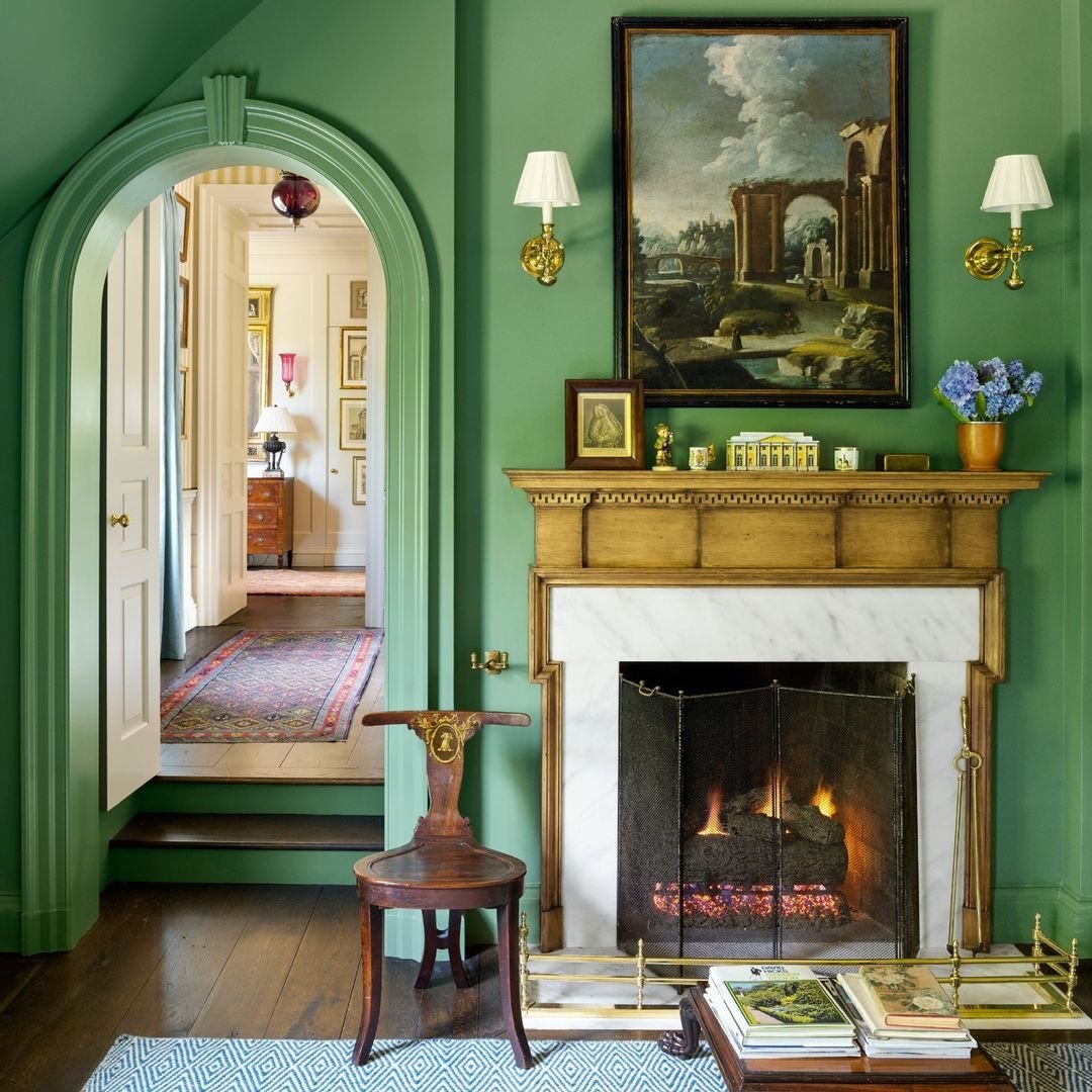 The green shows up in prints and textiles, woven through the space rather than dominating it. Paired with warm wood and ornate details, it creates a look that feels rooted in history yet still fresh enough to live in today.