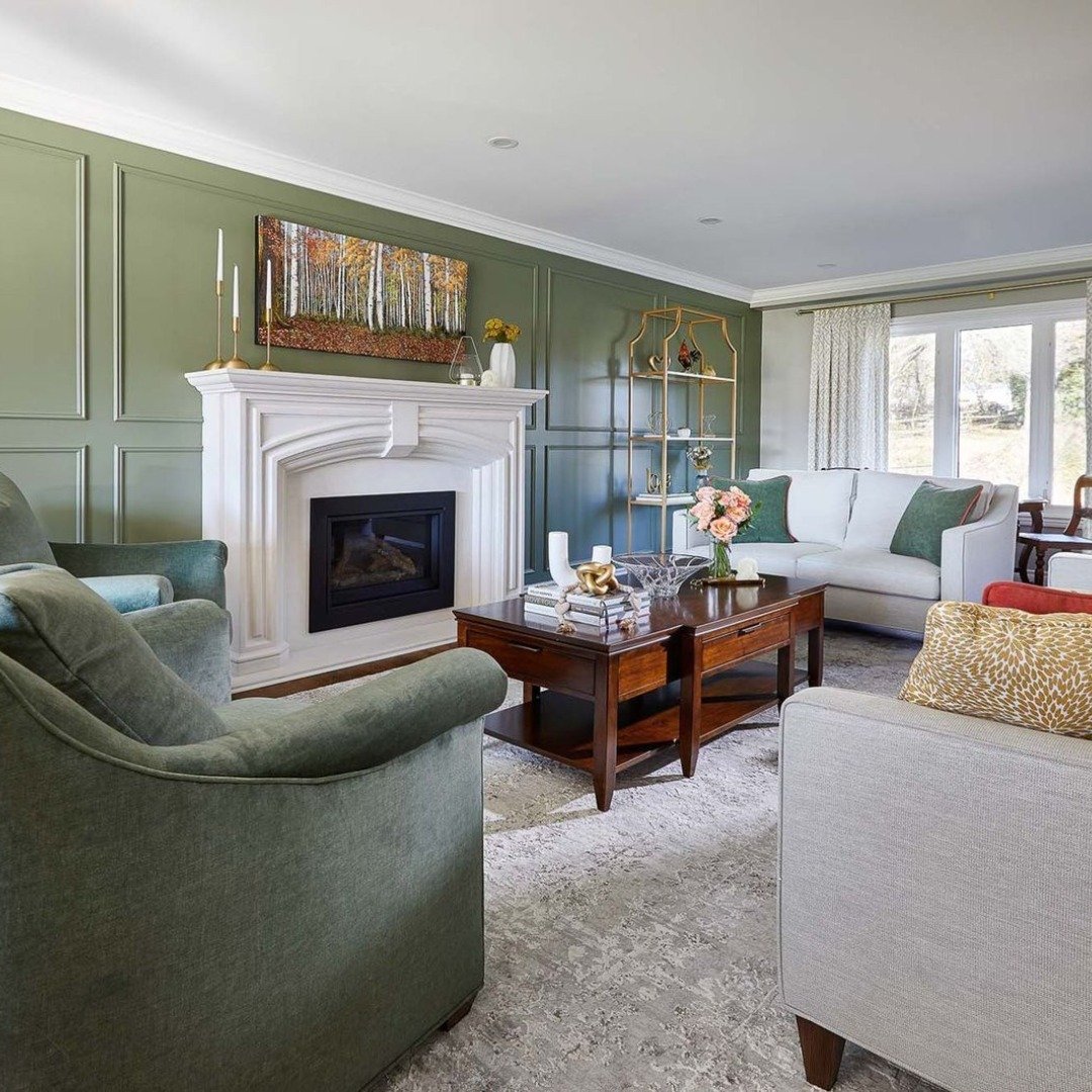 It’s the kind of space that tells a story. The artwork, the mantel styling, the architectural details, they all feel layered with intention. And that deep green backdrop just makes everything else feel more important.