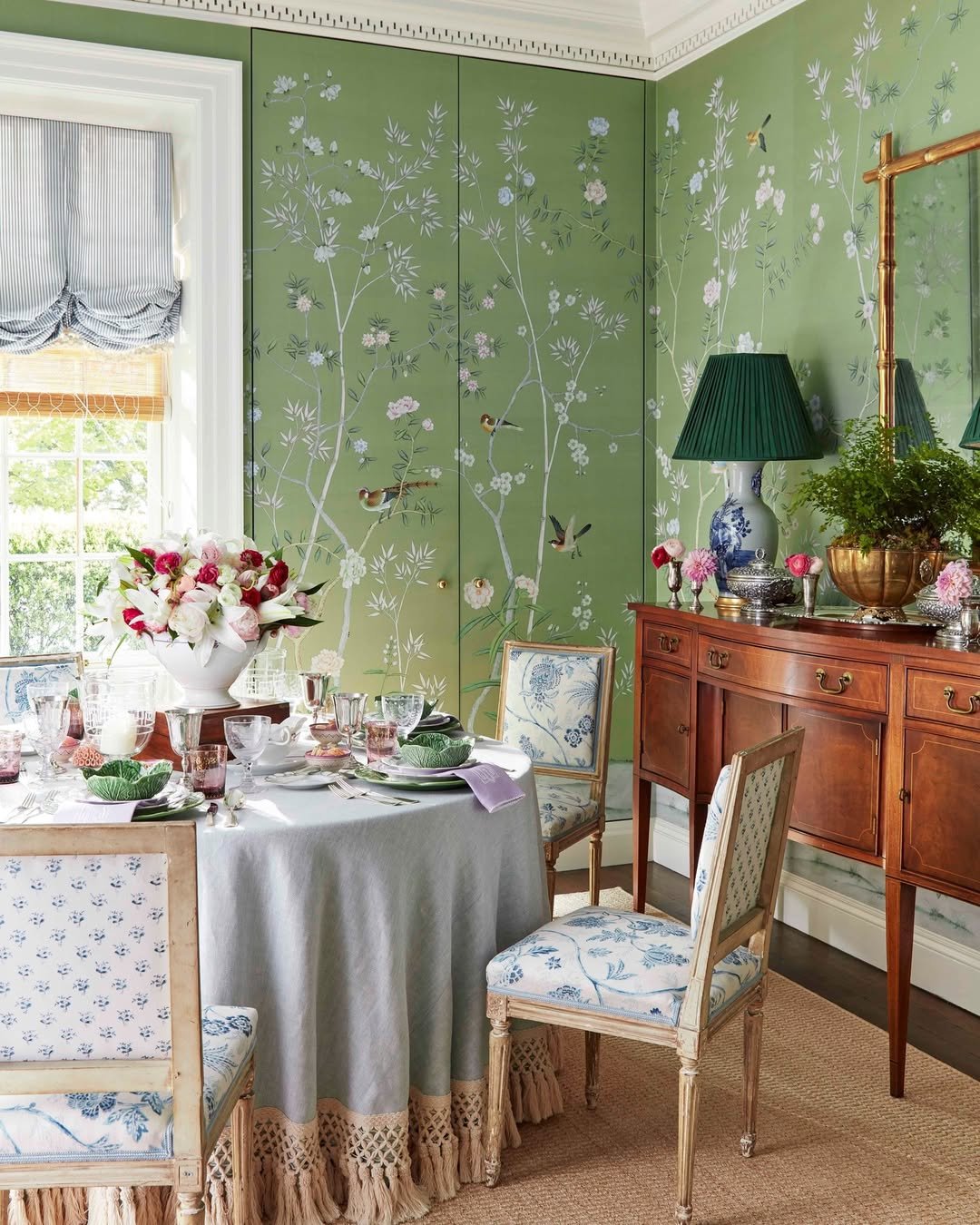 The table styling adds another layer, soft linens, glassware, and fresh blooms that echo the walls. It’s the kind of dining space that turns even a simple lunch into something that feels a little more special.