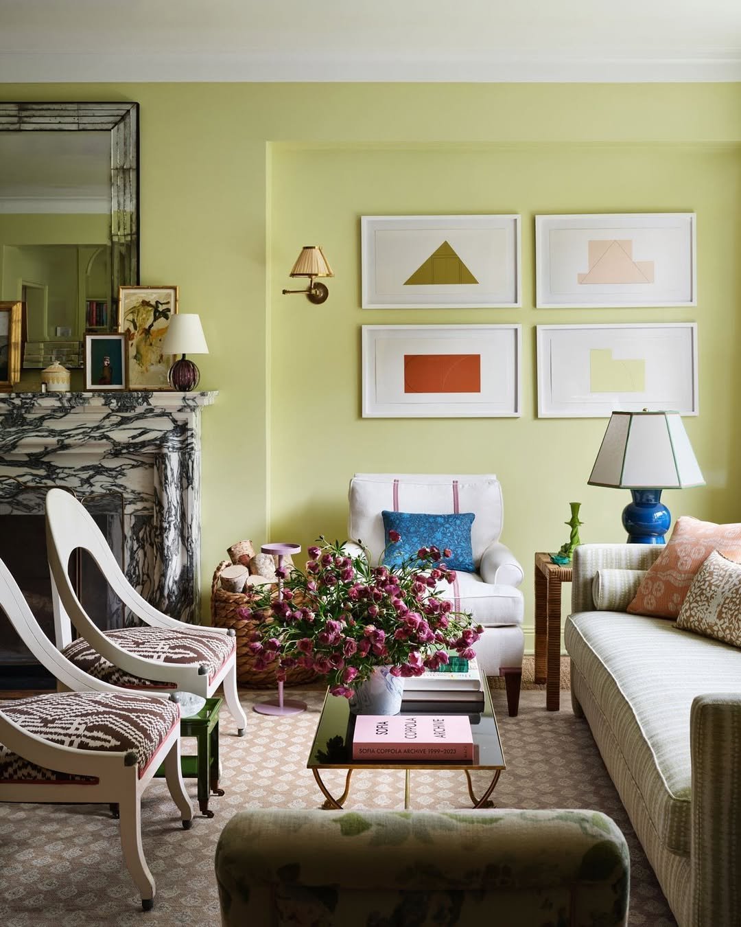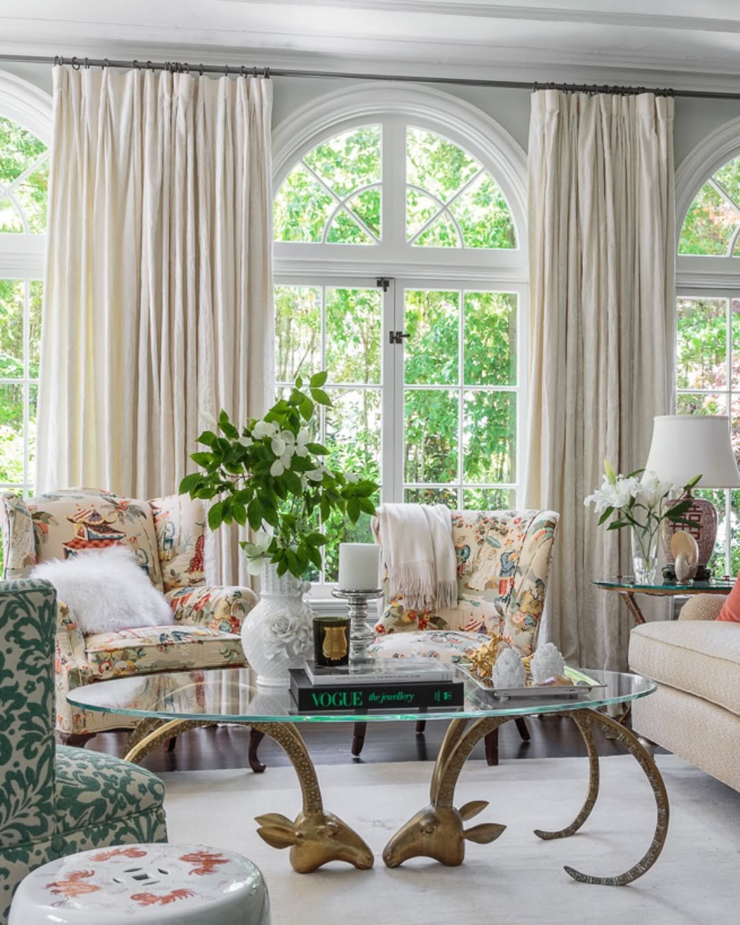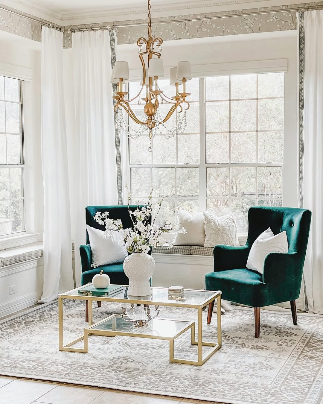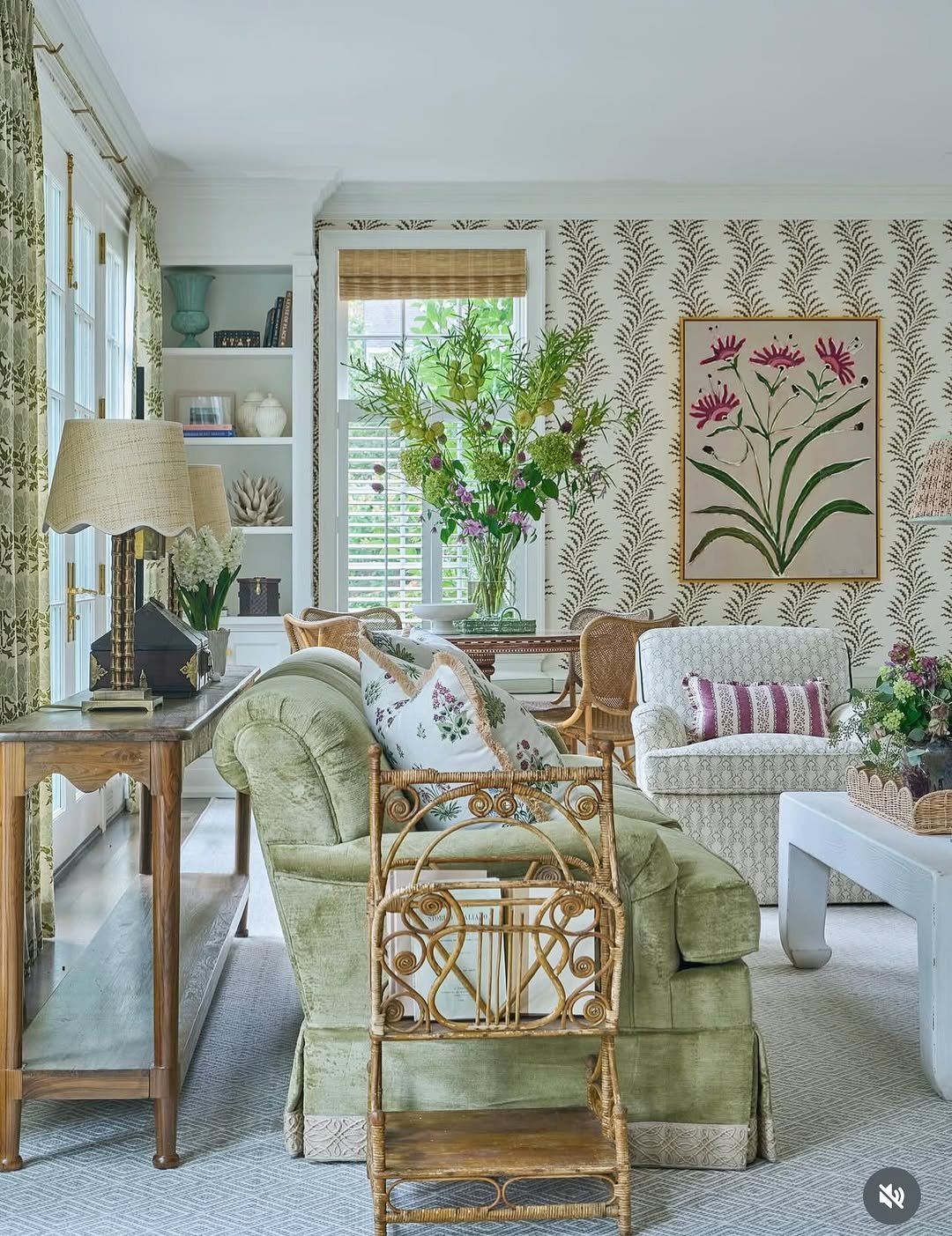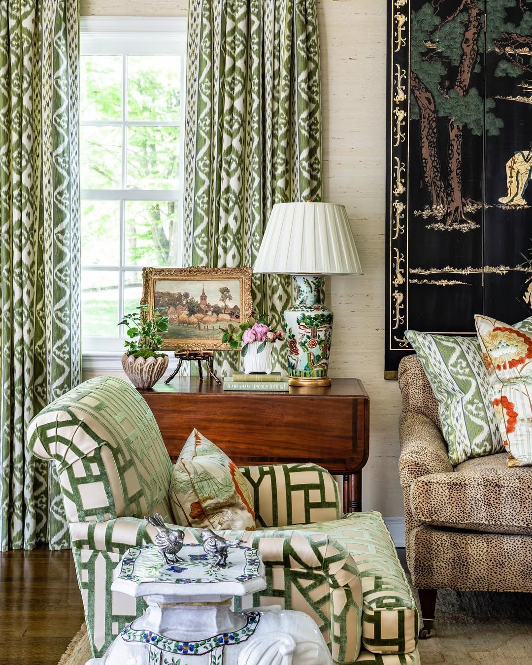 Light pours into this room in the softest way, bouncing off creamy curtains and pale upholstery. The green shows up in prints and subtle details, never overpowering, always supporting.