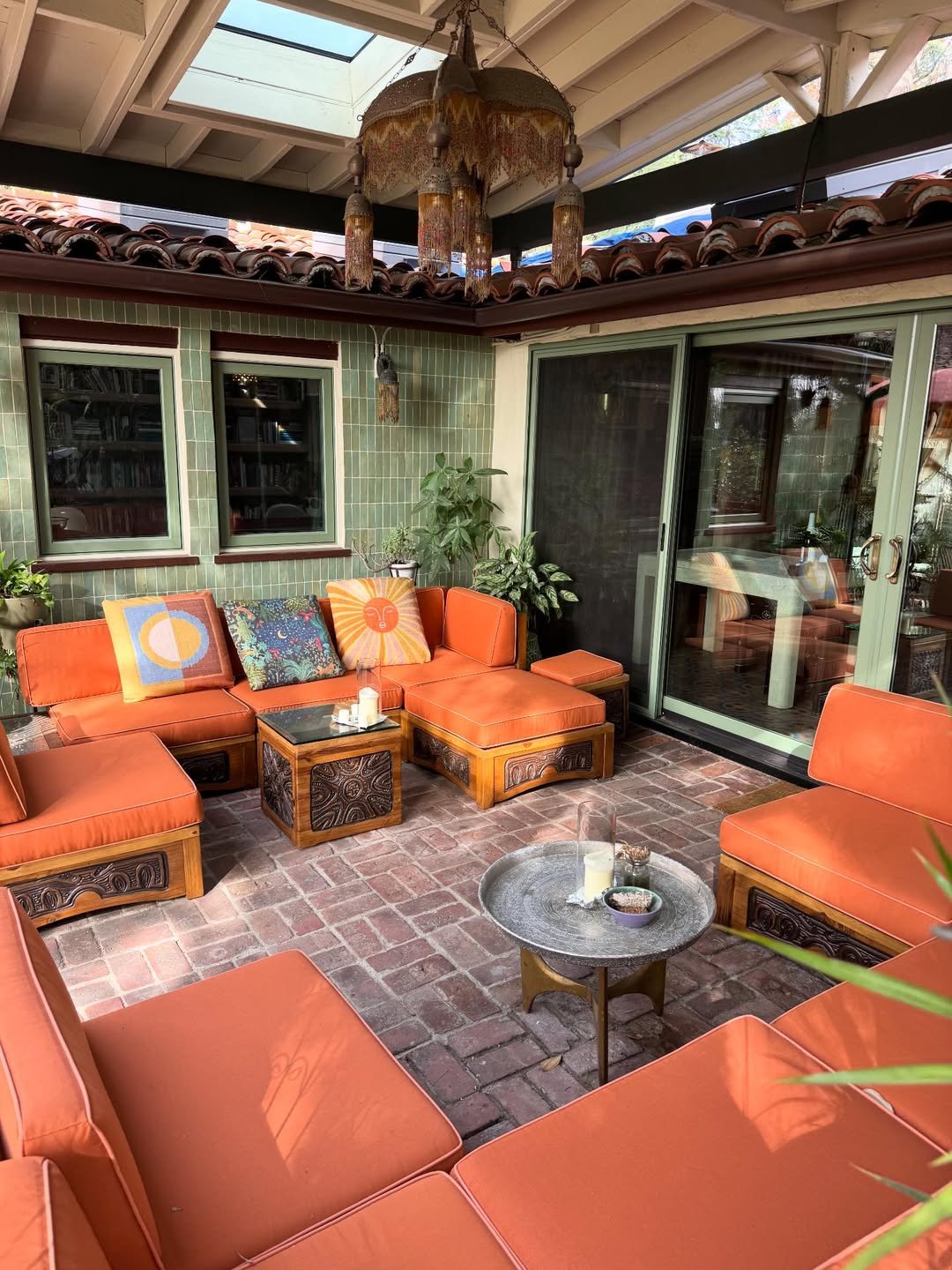 The green here isn’t just a color, it’s part of the environment. Paired with those bold orange cushions and layered textiles, the space feels alive. It’s the kind of setting made for long conversations, candlelight, and evenings that stretch on longer than planned.