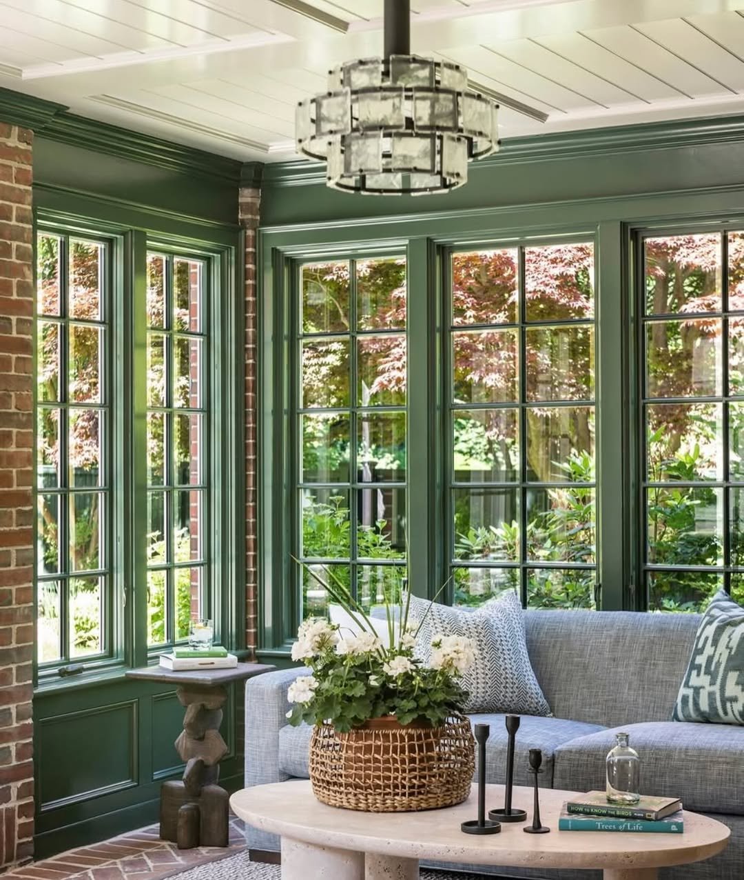 This space feels like it was designed around the windows first, and everything else simply followed. Deep green millwork frames the outside greenery so seamlessly that the boundary between indoors and out almost disappears.