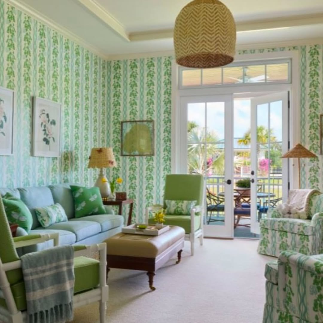 There’s an easy, sunlit energy here that feels almost like a vacation. The repeating green print wraps the room, creating a sense of cohesion that feels playful but still polished.