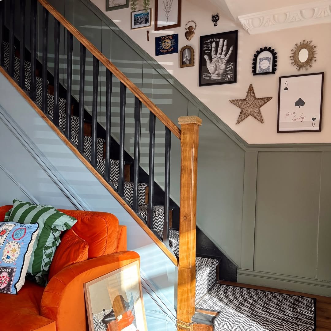 Here, green plays a supporting role to something a little more unexpected. The staircase detail and gallery wall bring in personality, while the green paneling keeps everything grounded.