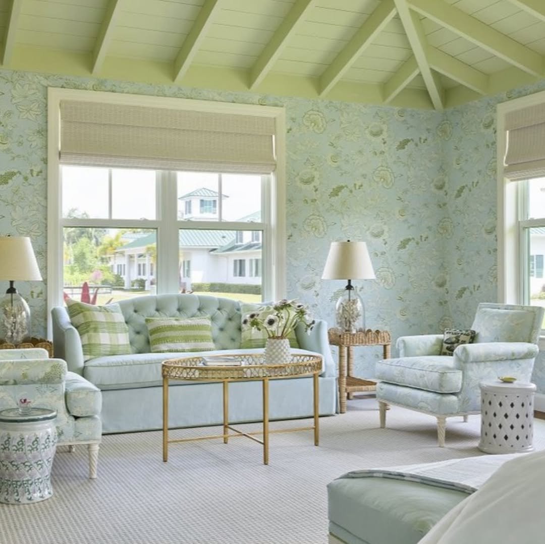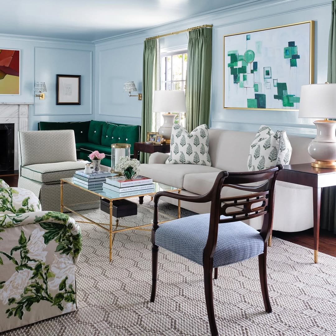 There’s a tailored elegance here that feels straight out of a classic East Coast home. Powdery blue walls meet crisp white upholstery, while those rich green accents anchor everything with just enough depth.