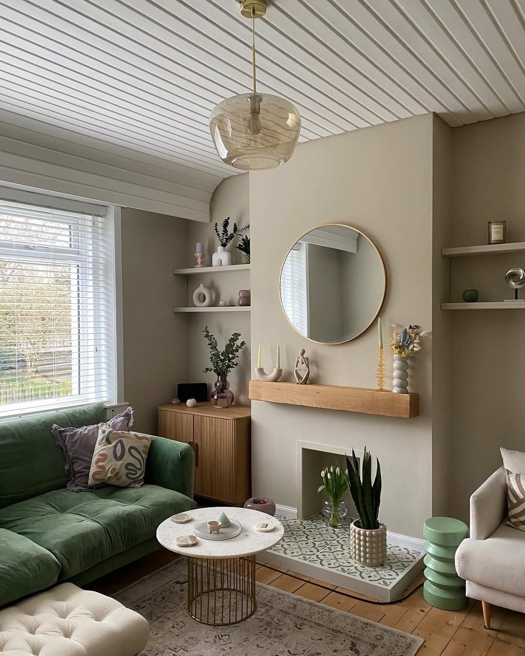 What makes it work is the restraint. The soft gray sofa and pale stone table keep things grounded, letting the green take center stage without overwhelming. Add in woven textures and a few sculptural accents, and suddenly it feels like the kind of room you’d spend an entire Sunday in without noticing the time.
