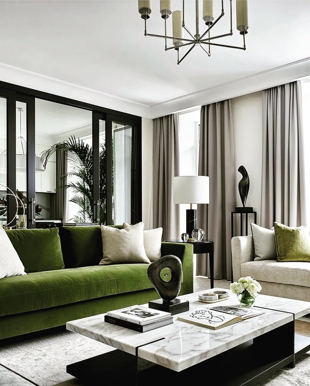 What I love most is how intentional everything feels. Nothing is extra, nothing is trying too hard. The marble table, the sculptural pieces, the soft neutral drapery, they all let the green carry the mood without overwhelming it. It’s polished, a little moody, and very grown-up.