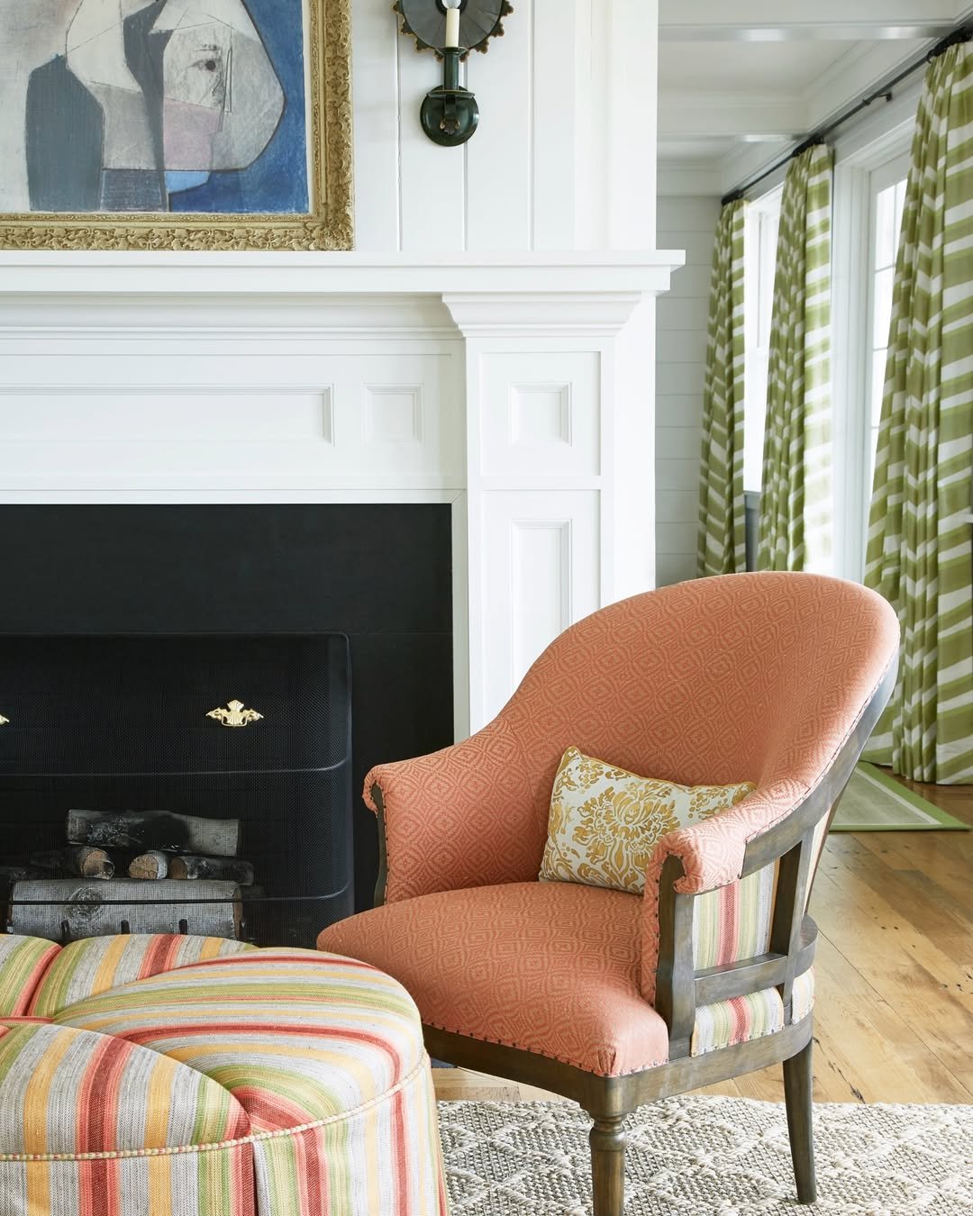 At first glance, it’s classic. White fireplace, clean paneling, structured furniture. But then you notice the coral chair and those striped drapes, and suddenly the room has personality.