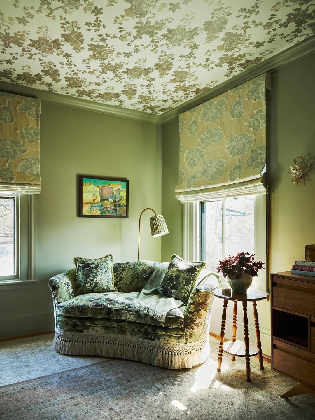 This little corner leans into a more nostalgic mood, where green becomes soft and enveloping rather than bold. The walls, the upholstery, even the ceiling pattern all echo each other in a quiet, tonal way.
