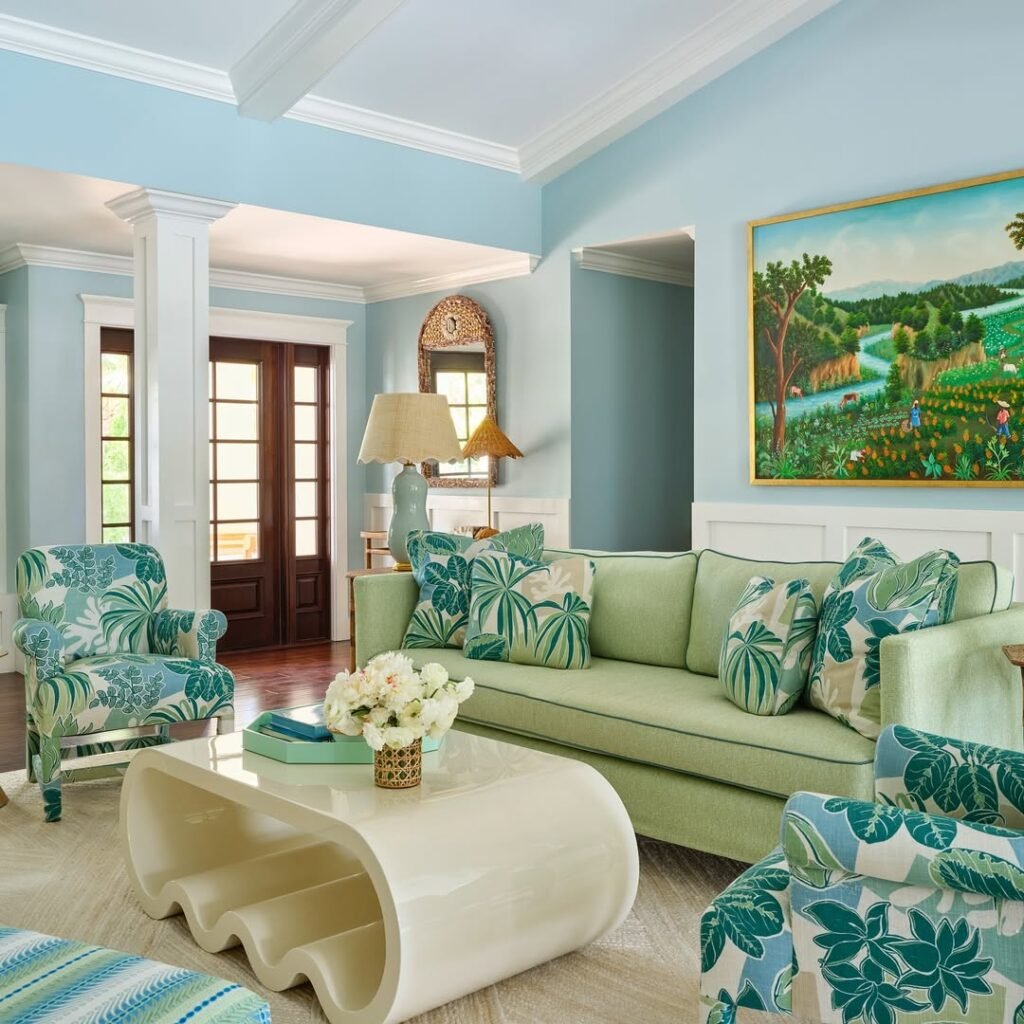 There’s a tailored elegance here that feels straight out of a classic East Coast home. Powdery blue walls meet crisp white upholstery, while those rich green accents anchor everything with just enough depth.