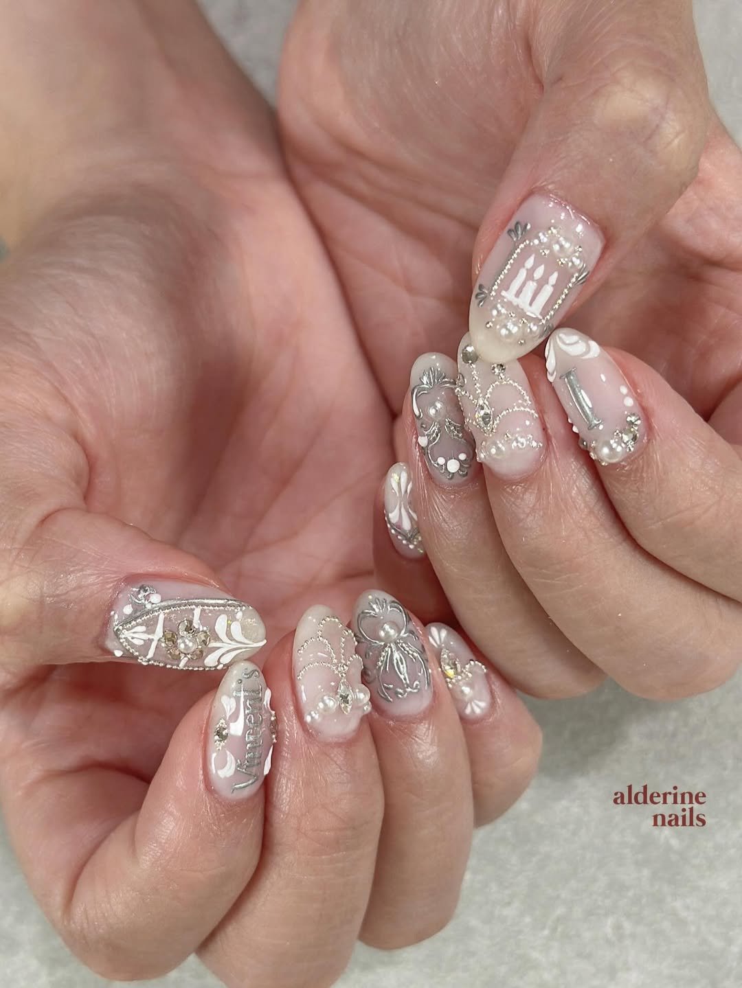 This set leans all the way into ornate elegance. Think milky white bases layered with raised chrome details, tiny pearls, and intricate silver frames that feel almost antique.