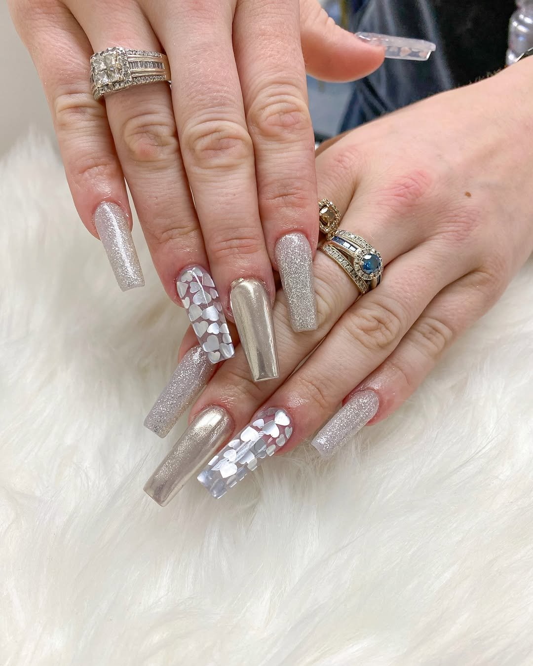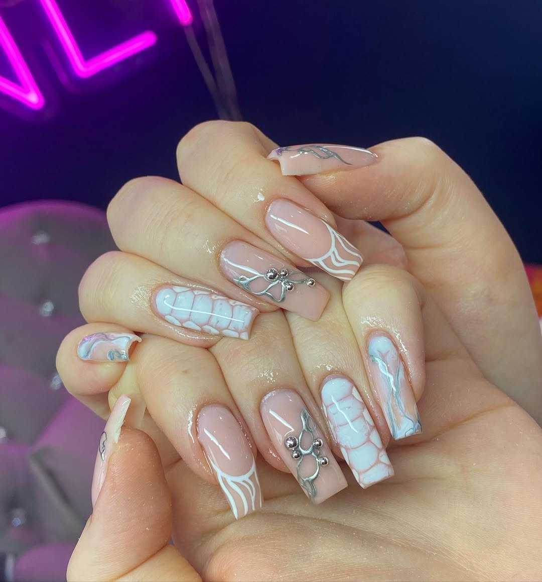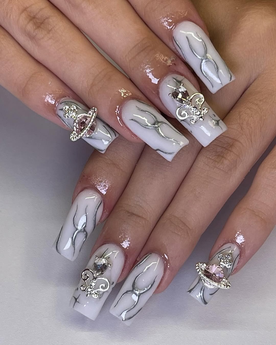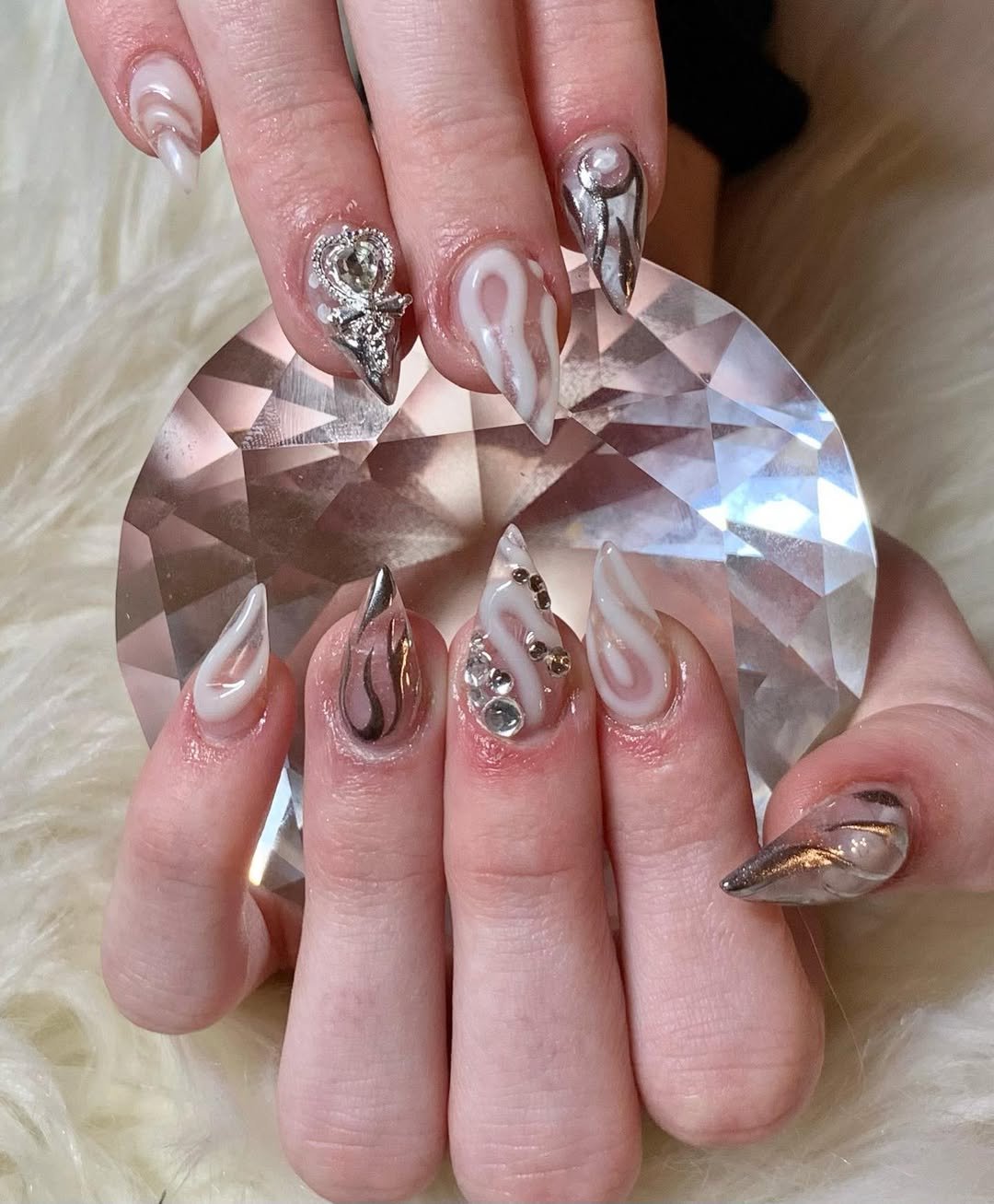 This mix brings together pale white marble, subtle silver striping, and sculpted metallic accents. Each nail feels slightly different, but the palette keeps it cohesive.