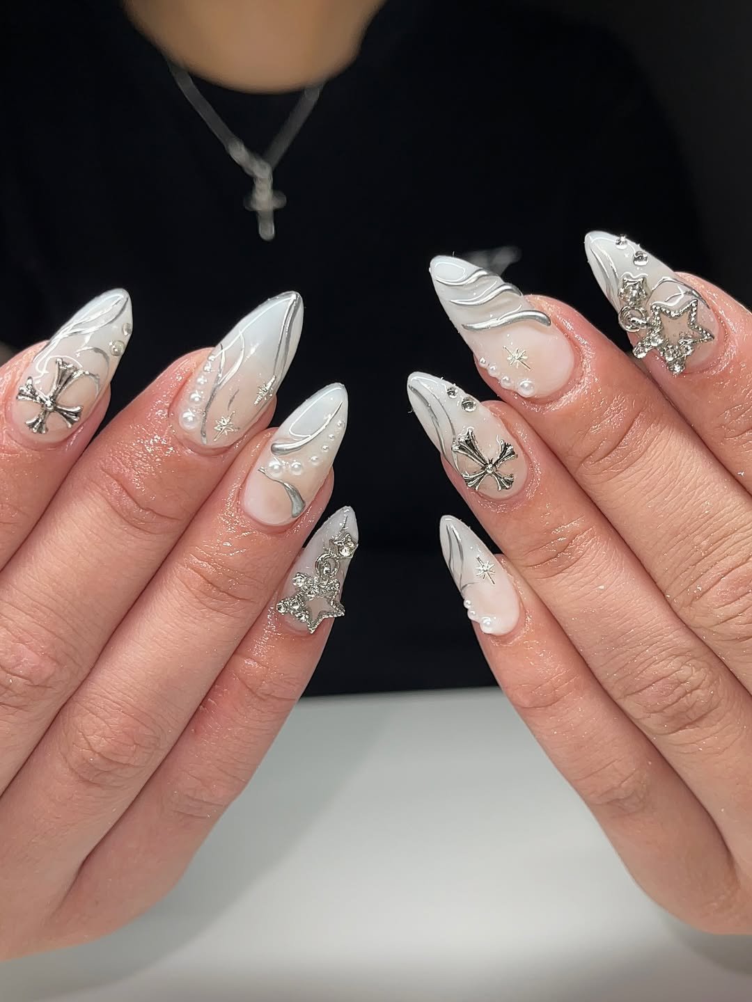 Long almond nails drenched in milky white and liquid silver details? Yes, please. The sculpted chrome swirls, star charms, and cross accents give this set a celestial, almost futuristic feel.