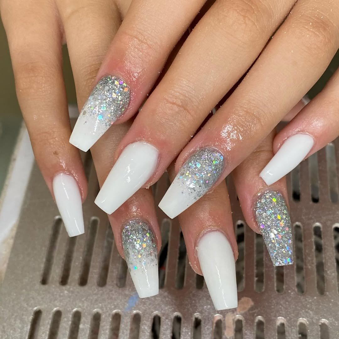 Here, cool white melts into chunky silver glitter in a seamless ombré that feels like fresh snowfall under city lights. The coffin shape keeps it sleek, while the glitter brings that party energy without tipping into excess.