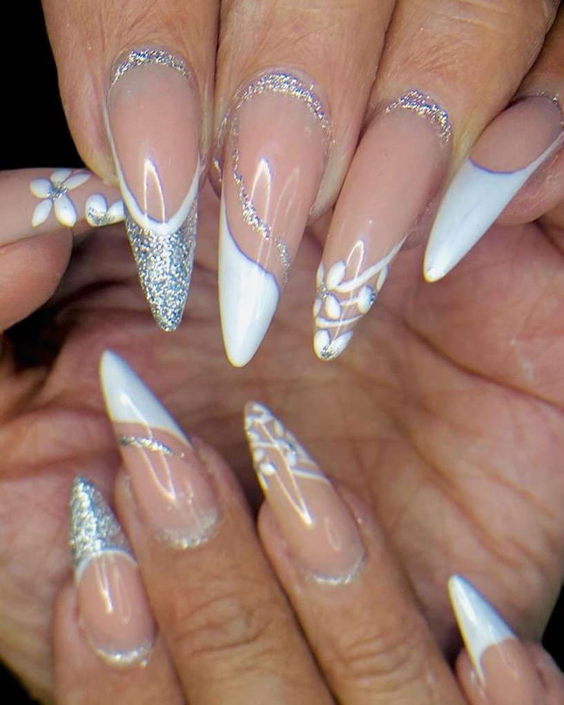 Classic white French tips get elevated with sweeping silver glitter arcs and floral detailing. The almond shape keeps everything feeling elongated and elegant.